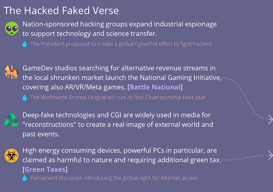 48/ Нехватка обрабатывающих мощностей, в том числе специлизированных серверов и вычислительных блоков приводит к необходимости регулирования импорта и использования конфиската на нужды общества. Политическая игра продолжается: парламент обсуждает две противоречащие друг другу инициативы. С одной стороны, интернет и вычислительные мощности, как фундаментальное право человека. С другой стороны, требование признать суперкомпьютеры и глобальные облака опасными для природы и подлежащими зеленому регулированию и защите от использования для абьюза. [Green Taxes]