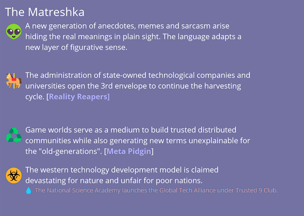 20/ Во второй раз надо понять, что происходит в самом нижнем “G-Verse”-слое (об этом далее) и как он пронизывает все остальные. Для этого внимательно проследите за событиями с карусельками (🎠) и токчисностью (☣️). Это та реальность и, если хотите, почва, в которой будет скрываться, вызревать и прорастать Corp*Verse. Обратите внимание, как эта реальность колеблется между стремлениями к светлому будущему (🦄) и прекрасному прошлому (🦖).