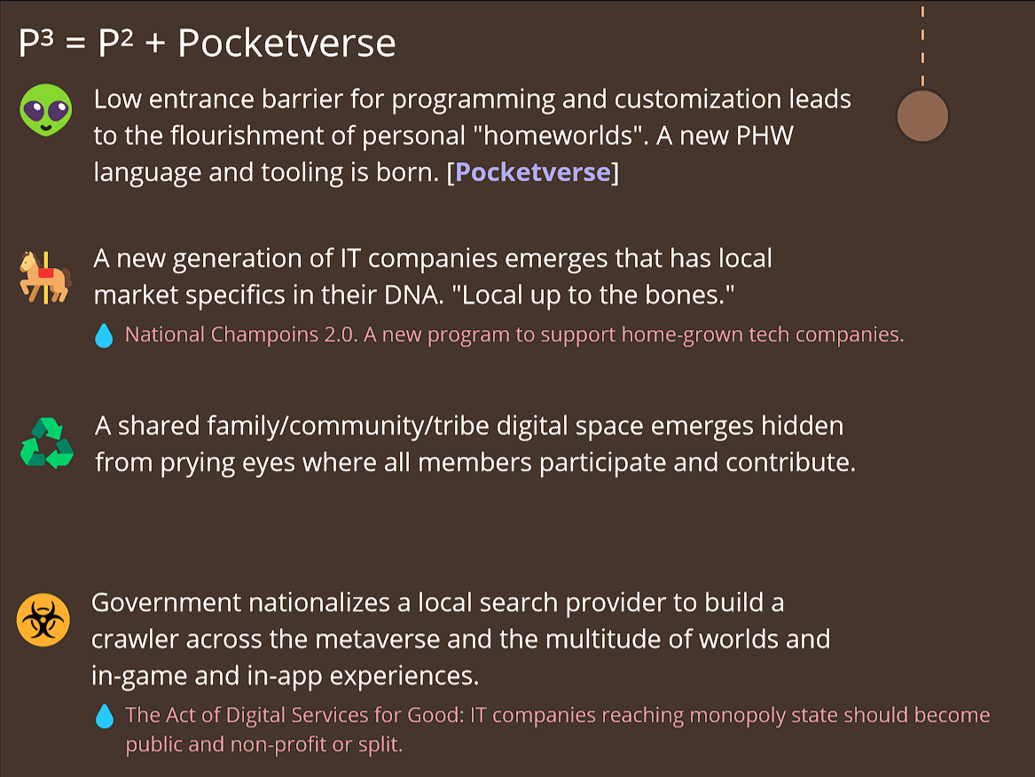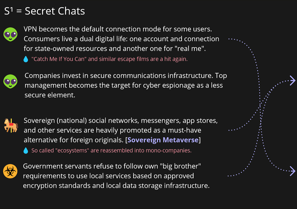 59/ Суверенные (национальные) социальные сети, мессенджеры, магазины приложений и другие сервисы получают шанс на существование, так как в силу регулятороного обязательства по приземлению данных и раскрытию рекомендательных алгоритмов, санкционных политик и других ограничений часть глобальных игроков “уходит”. Государство активно пересобирает экосистемы в “монокомпании” по модели национальных монополий. Прятаться в [Sovereign Metaverse] становится все сложнее.