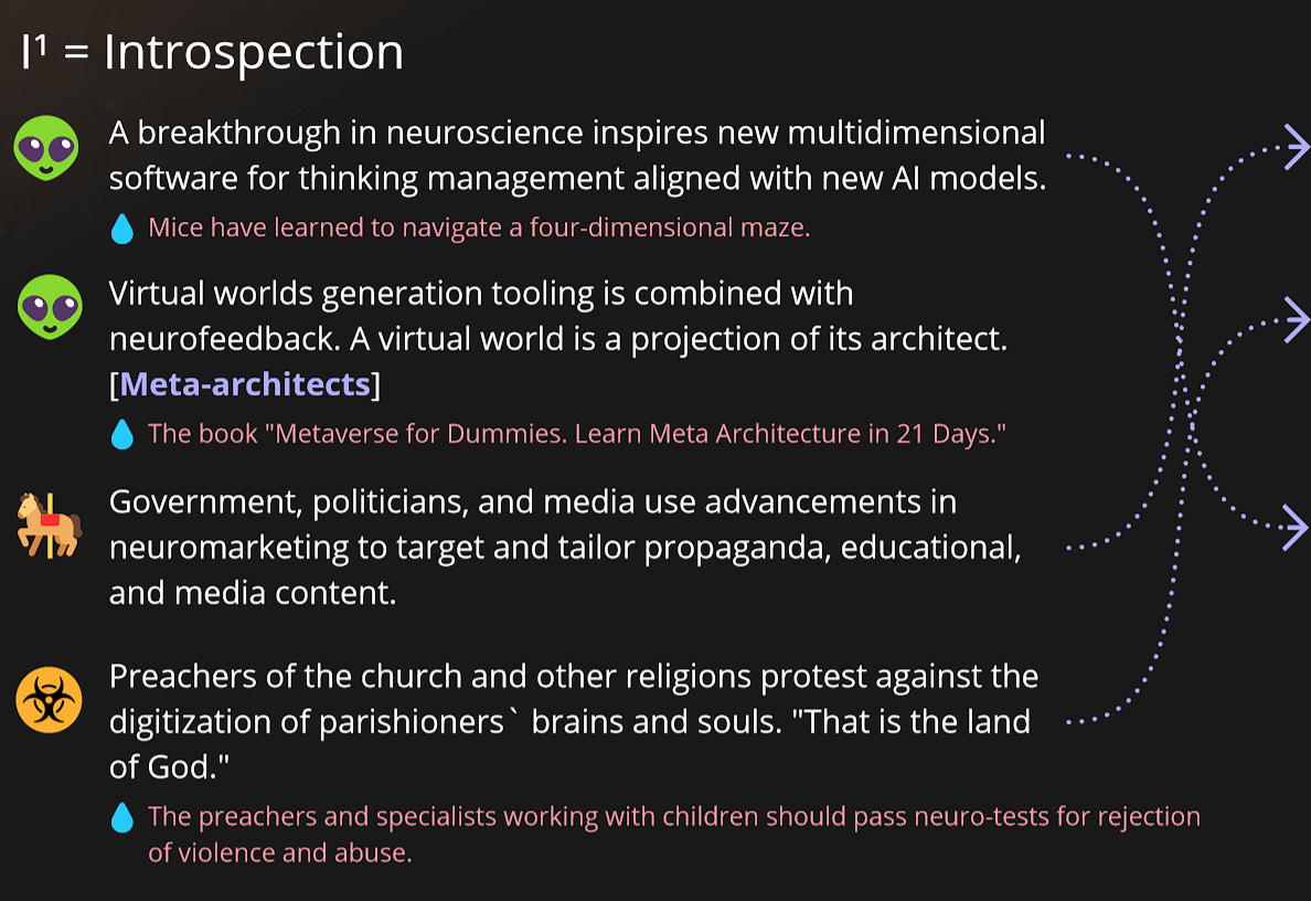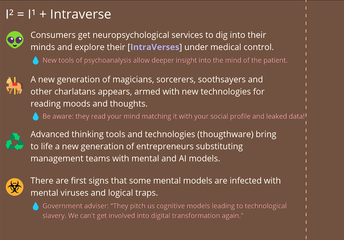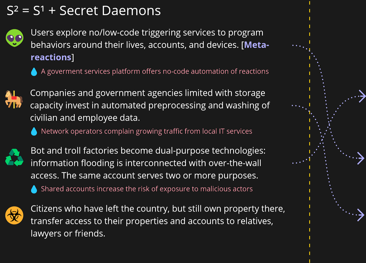 41/ Тоскующие по прежним ценностям и скрепам разработчики и дизайнеры играют в партизанщину, постепенно пронизывая свои решения тонкими намеками, размытыми заявлениями, косвенными наставлениями, завуалированными посланиями и скрытыми пасхалками. Ткань дживерса пронизывается скрытыми ходами, миром подпольных смыслов, секретных алгоритмов и дремлющих нейронных моделей. Но это общий с государством разворот, а не движение в обратную сторону.