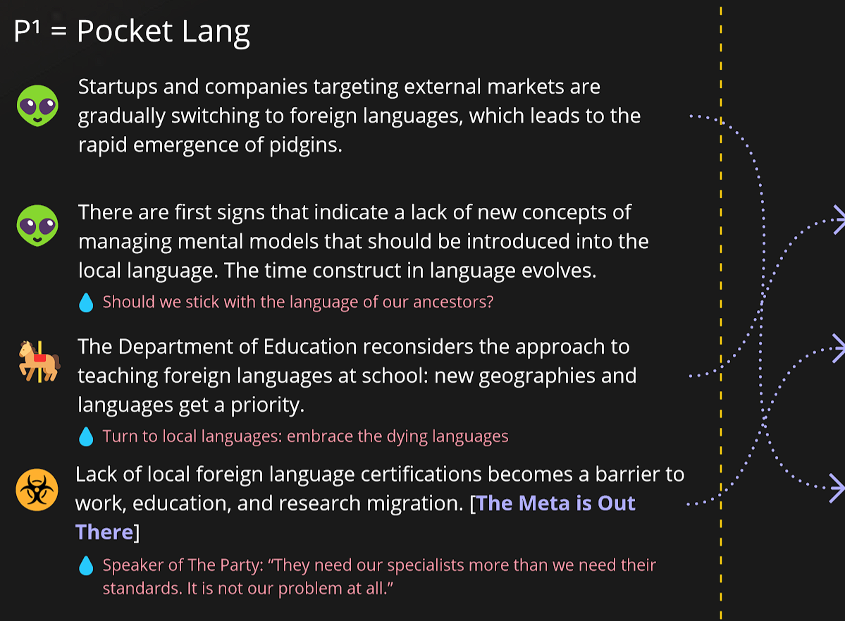 24/ Про иконки. В каждом блоке (карточке) мы выделили три-четыре ключевых типа событий или проявлений, но они не такие, как в первой части исследования. Мордочка пришельца (👽) – это про создание для другого мира, который где-то там, то ли снаружи, то ли внутри, но точно не здесь. Карусельная лошадка (🎠) символизирует хождение по кругу и переливание из пустого в порожнее: вроде бы что-то делают, энергия и деньги тратятся, но ничего не происходит, зато весело. Йеее-ху! Символ переработки (♻️) – это про суровую реальность: когда ничего нет, приходится делать из говна и палок, простите. Переиспользовать, переназначать, пересобирать. Пере-, пере-, пере… Биохазард (☣️) – это знак биологической опасности: тут должны проснуться ваши природные инстинкты и подсказать, что определенных ситуаций лучше избегать. Поверьте, целее будете.