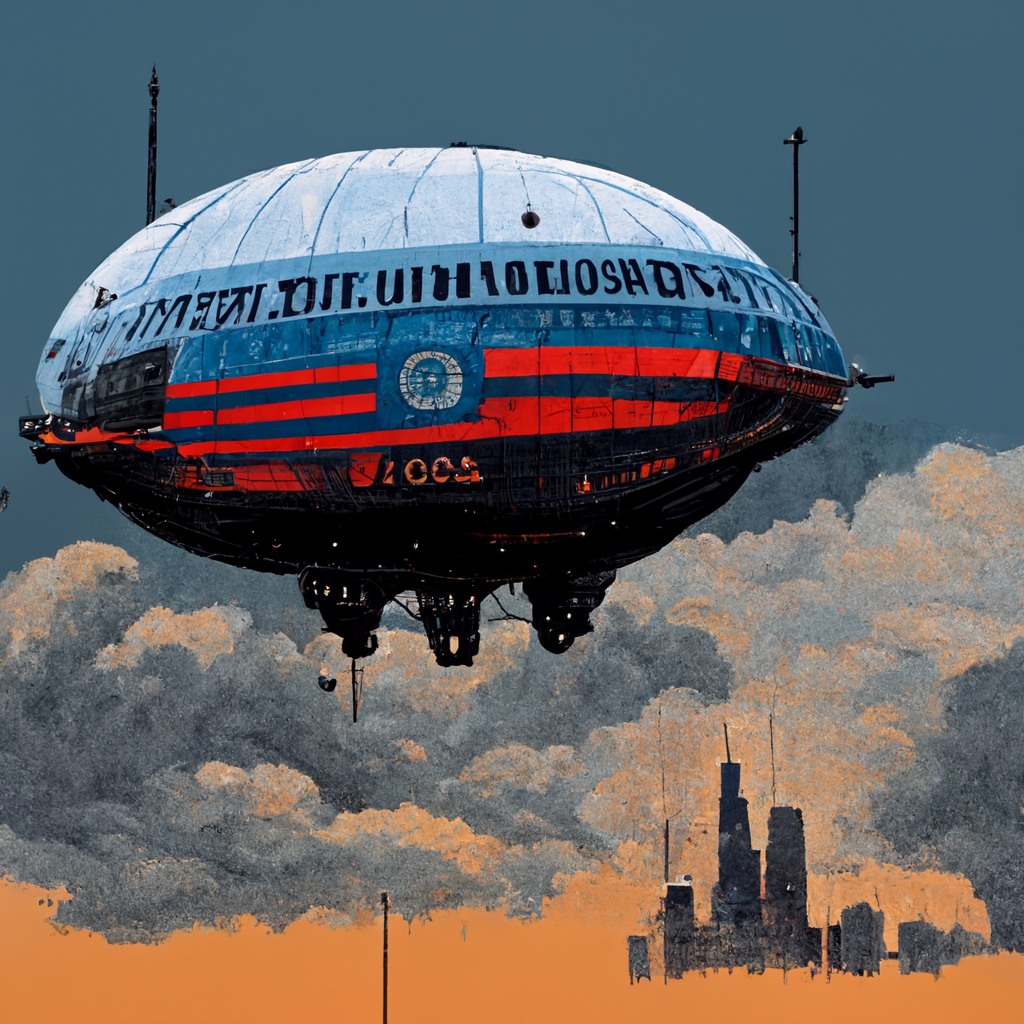 Midjourney: state government propaganda airships with Trump 2030 face flying over Chicago