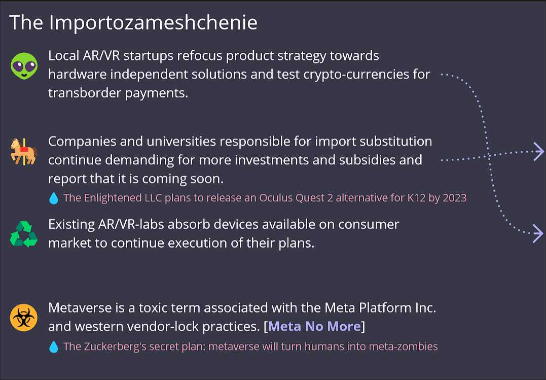 34/ Компании и университеты, которые прибиты к земле гвоздями и на веки вечные с родиной, готовятся осуществить прорыв. Как минимум на бумаге, но нужны деньги. Много денег. Замещение технологий дешевым быть не может. Если очень попросят, то можно даже нарисовать собственный суверенный шлем виртуальной реальности, не хуже второго квеста. Но через год, или два. Дайте денег, а?