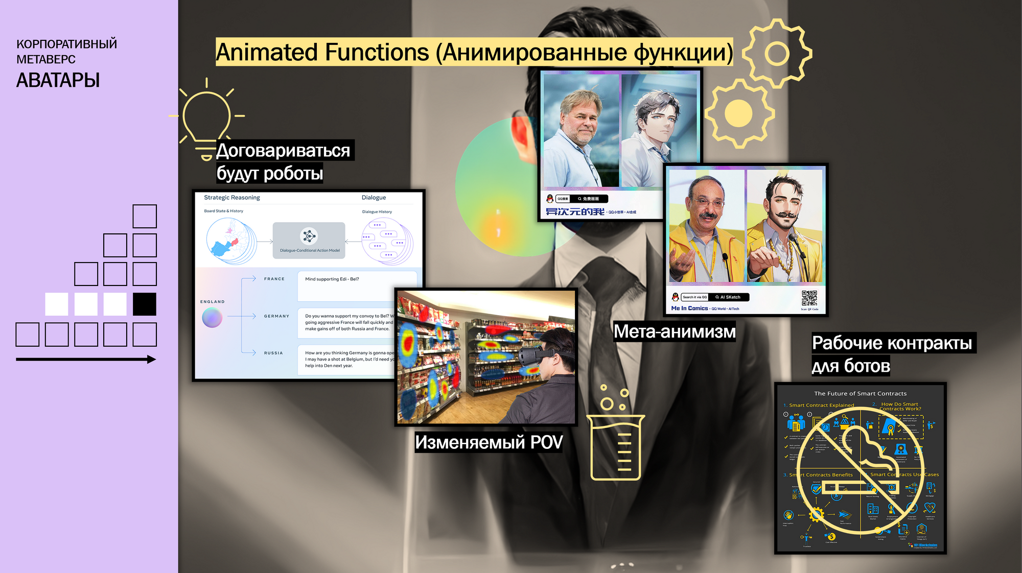 Эволюционно, мы протягиваем развитие аватаров от “простой куклы” (аватара) — графического представления человека, анимируемого в реальном времени в соответствии с движением и речью человека, к “аватарам”-помощниками, за которыми стоят алгоритмы, написанные сотрудниками, и которые становятся их “второй парок рук”. Далее эти две темы объединяются: алгоритмизированная составляющая “приделывается” к аватарами самих сотрудников, позволяя создавать асинхронное теневое поведение. И на четвертом шаге мы делаем “форк” – и прикрепляем эту функцию к софту, анимируя и искусственно социализируя его через естественные интерфейсы (NUI).