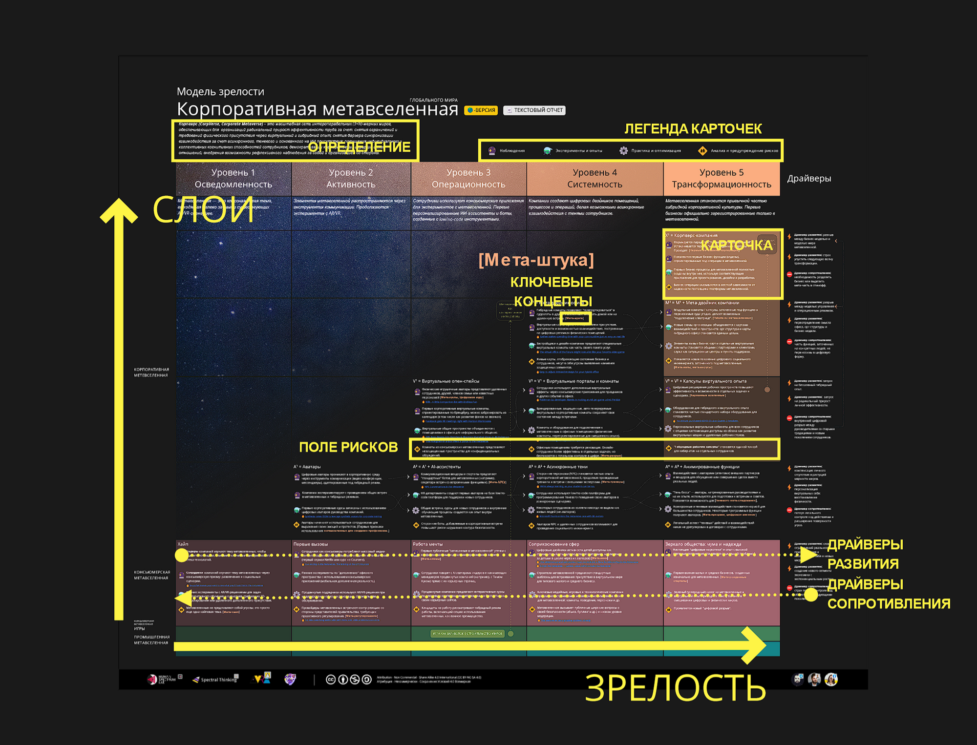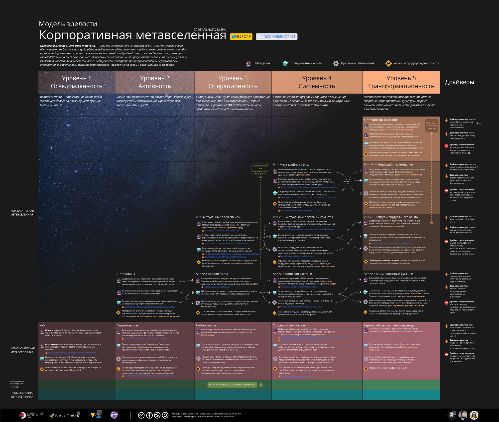 II.2 Первый раз надо последовательно пройти горизонтали (строки): сначала консьюмерский слой, потом аватаров, потом виар-пространства, потом мета-офисы и двойники, наконец, корпверс-компанию. Просто слева направо читайте, смотрите стрелочки там, где они есть. Следите за эволюцией понятий. Справа вы найдете драйверы – попробуйте проследить, как они развиваются в соответствующих слоях.