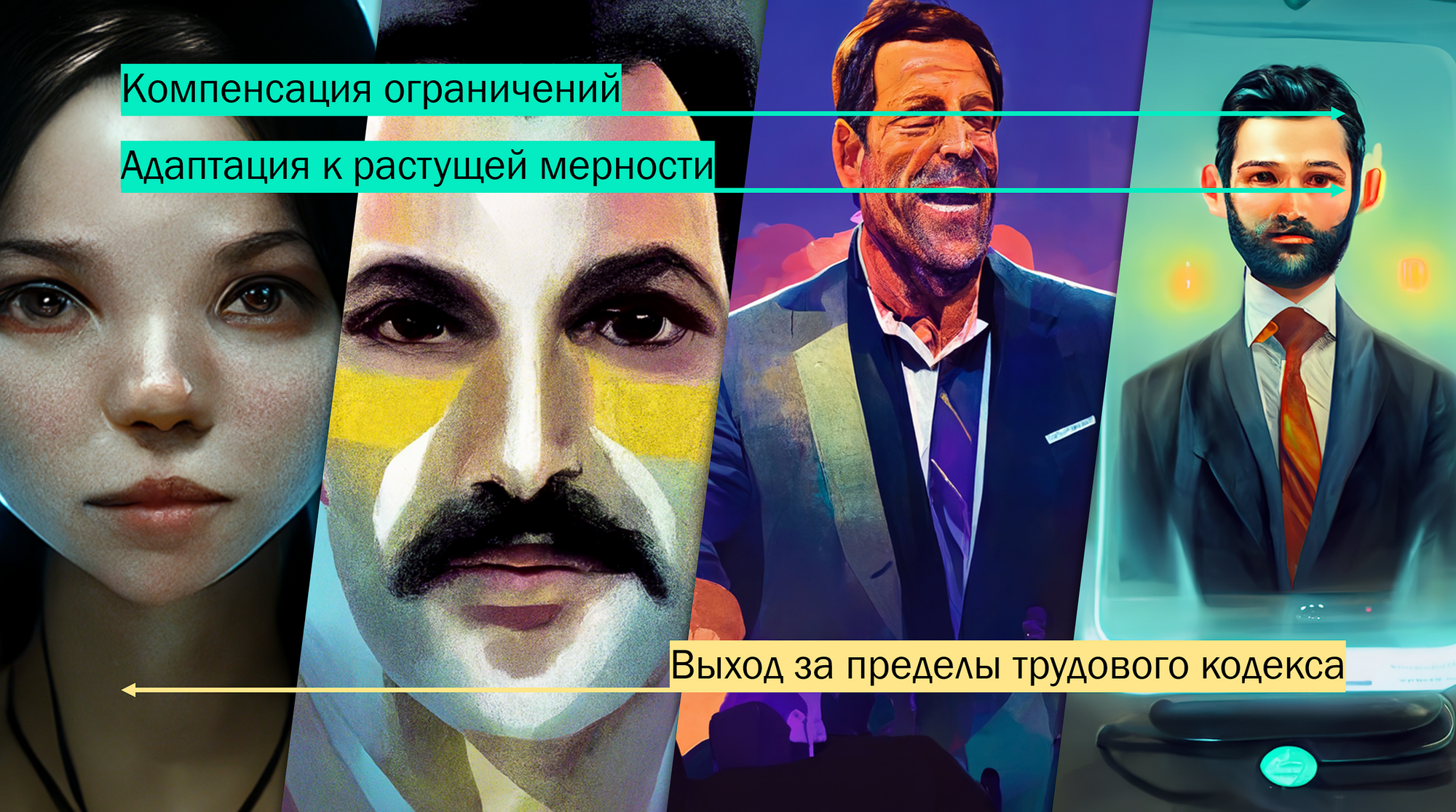 Персональные аватары, создаваемые сотрудниками (и вообще людьми) для себя, — это не просто виртуальное отображение или проекция, созданная по образу и подобию. Это манифестация и отчасти идеализация себя в образе, выставленном на показ, достаточно совершенном, независимо от реального состояния дел. В пределе, выражаясь языком инклюзивного дизайна, это компенсация для всего спектра ограничений.
