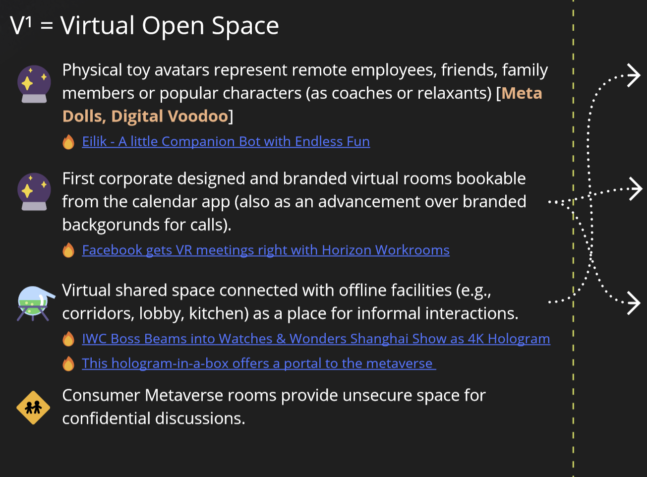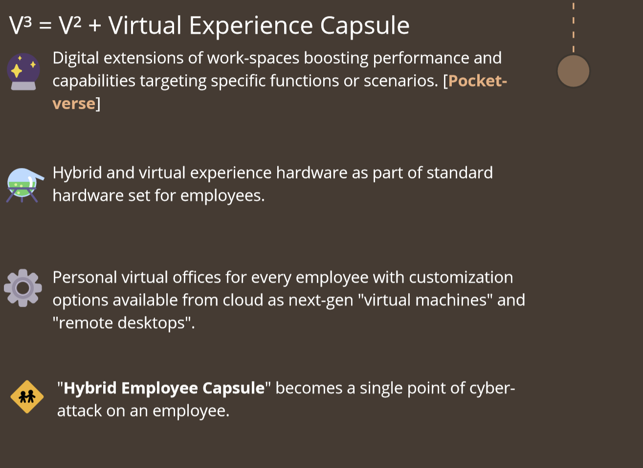I.7 Из всего многообразия метаверса, который нам обещают фантасты и спекулянты, наиболее реалистичным, понятным и близким к разворачиванию нам представляется его корпоративный сегмент, – Леша шутит, что это просто Костя ставит на эту тему, – тот где белые воротнички и их начальники бесконечно зумятся и тимятся, где Цукерберг призывает всех срочно аватаризироваться и общаться в шлемах (потому что в офисы все равно никто не ходит и возвращаться не спешит), где корпоративы в онлайне могут оказаться “и ни че так”, где начальники будут играть “в куколок” и “солдатиков”, боясь признаться себе, как скучали по своим любимым игрушкам из детства.
