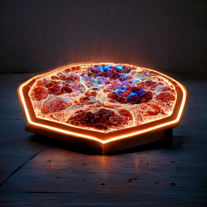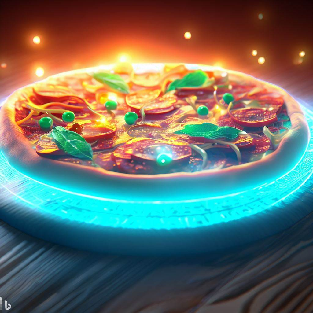 Midjourney’2022 (left), Bing AI’2023 (right): glowing virtual pizza on a wood table
