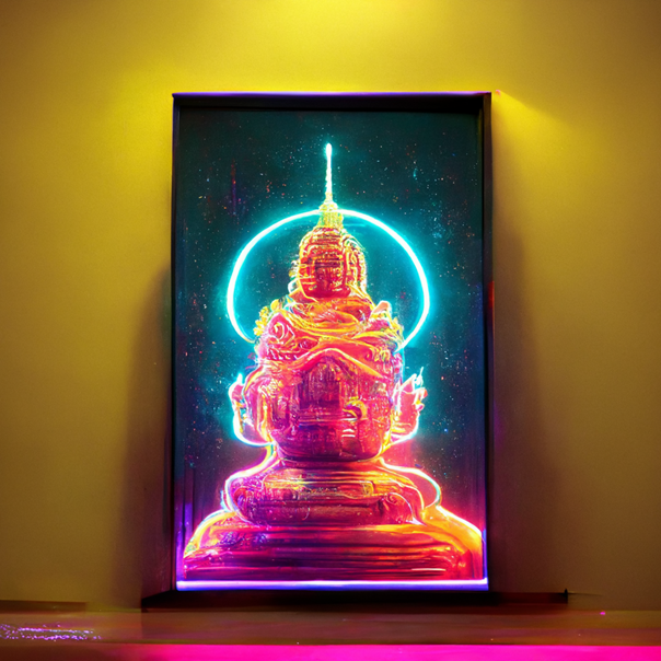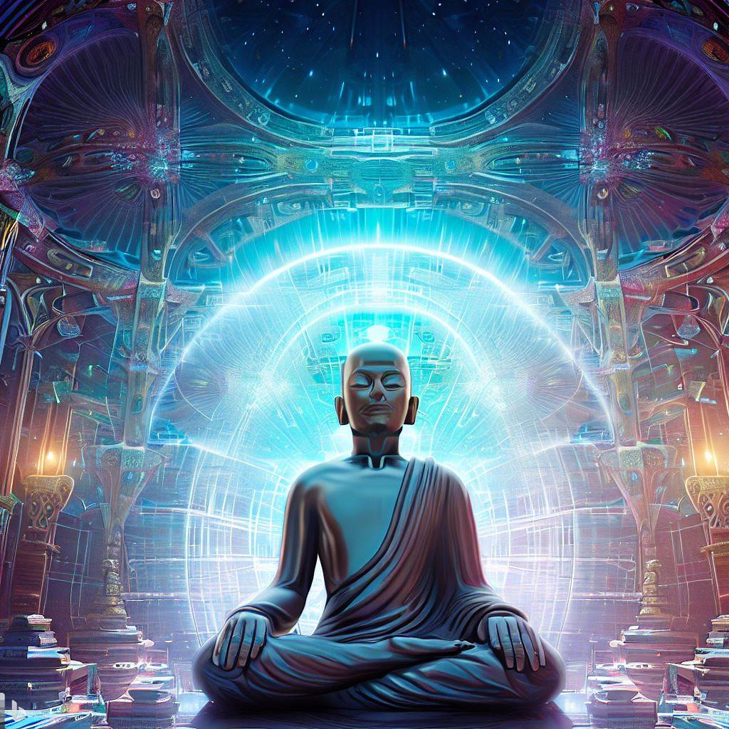 Midjourney’2022 (left), Bing AI’2023 (right): digital budha in cosmic palace