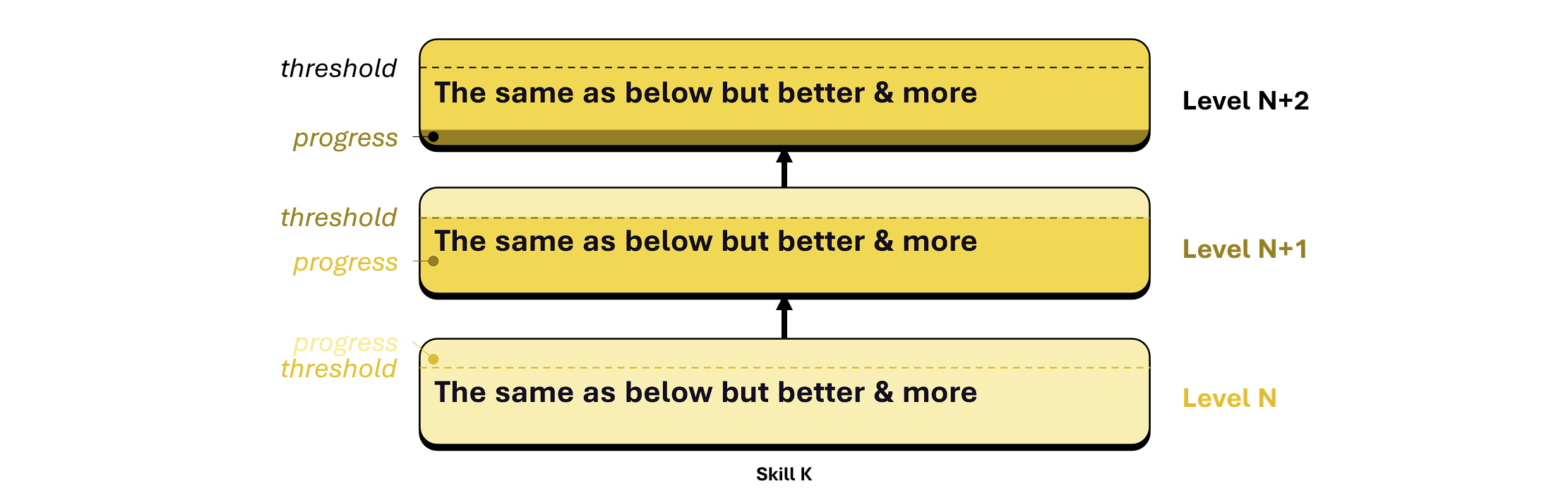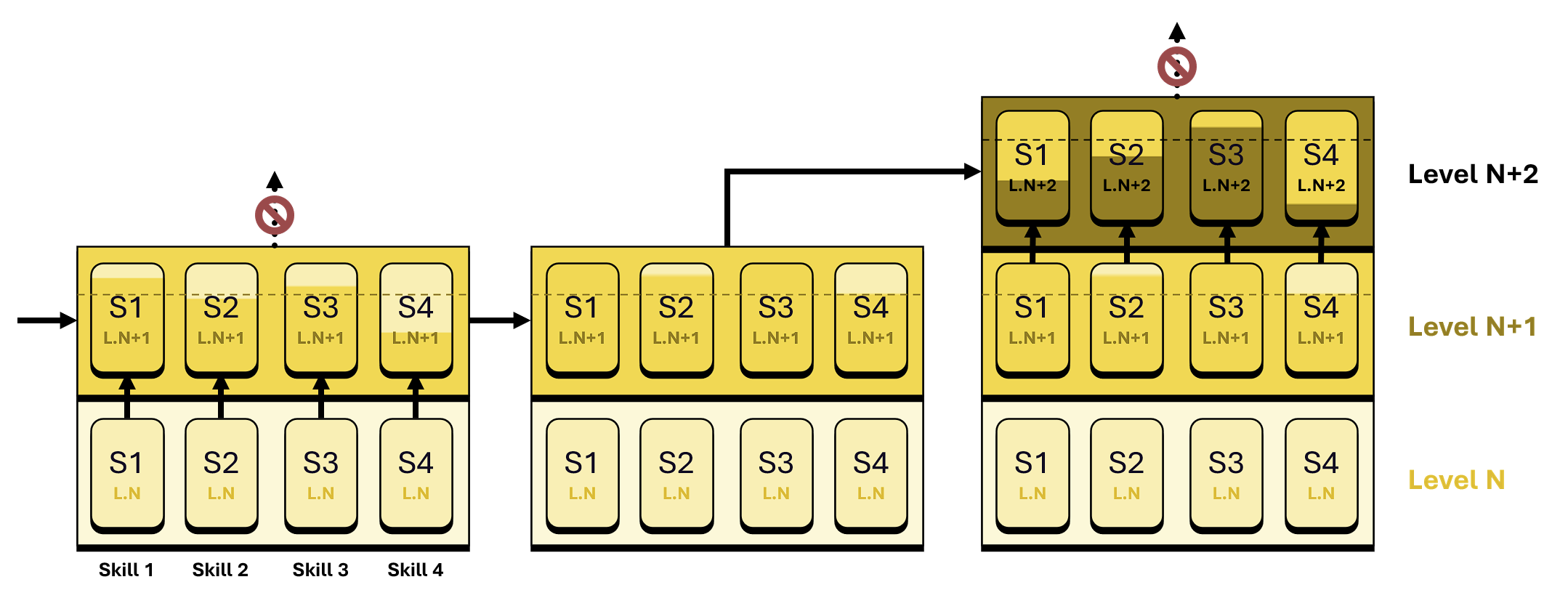 Эта же схема, но с учетом прогресса каждого из скиллов при переходе по уровням выглядит так: