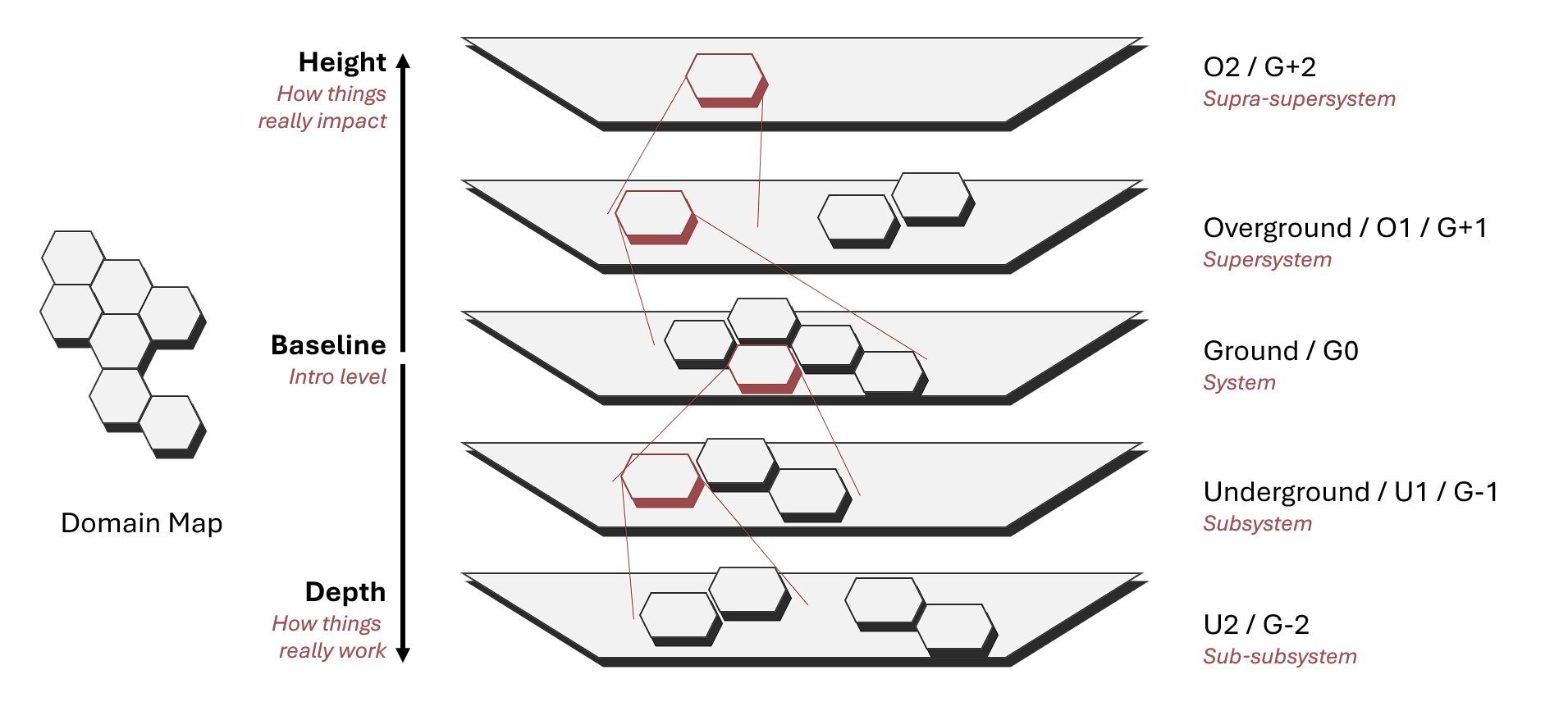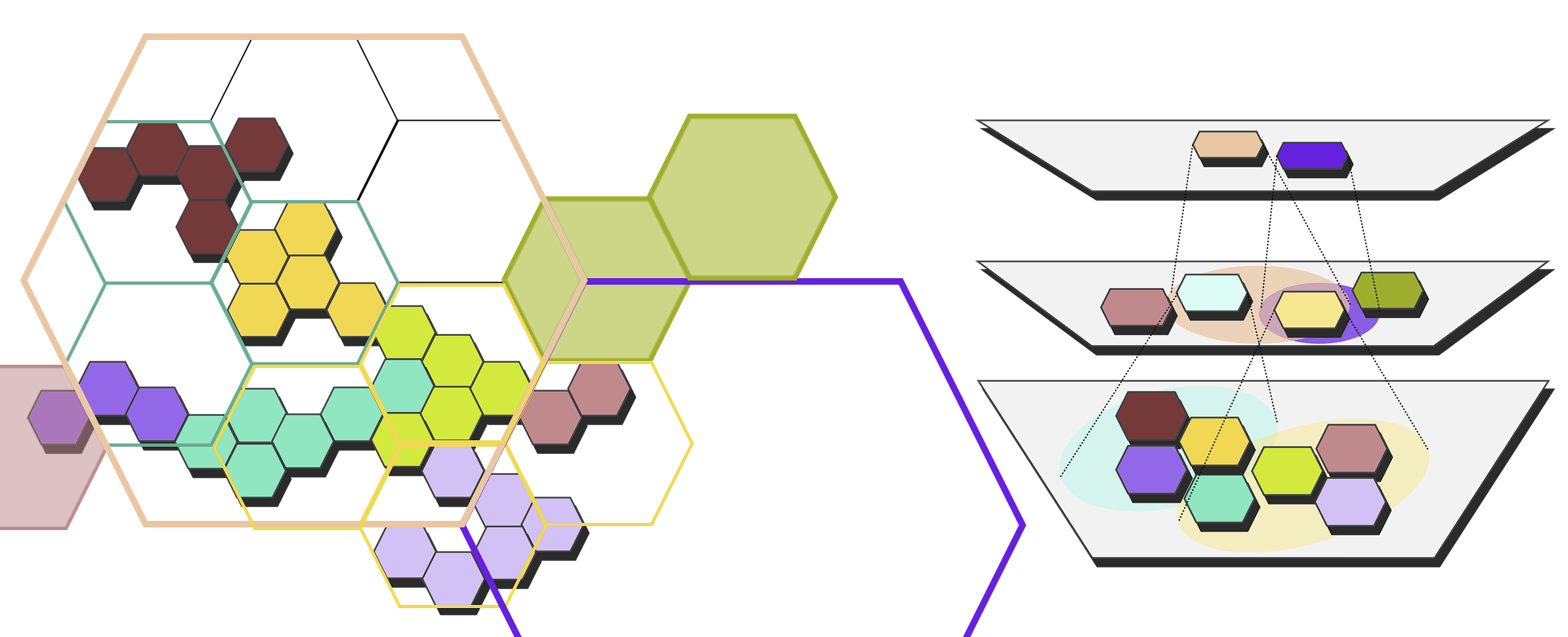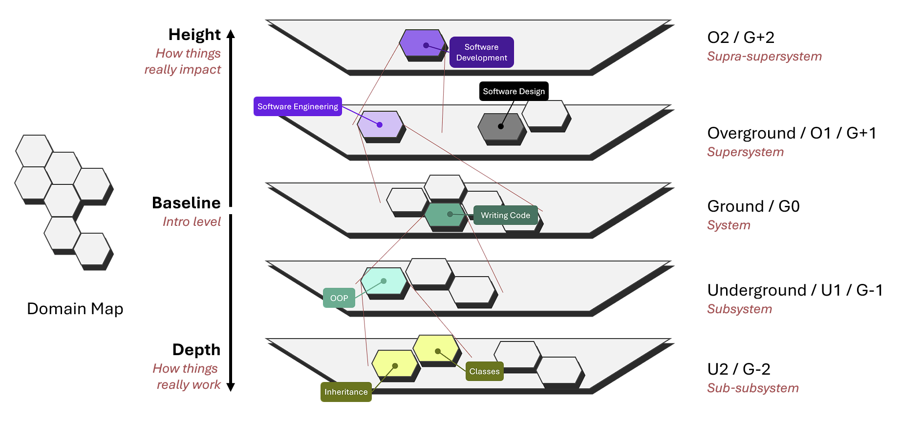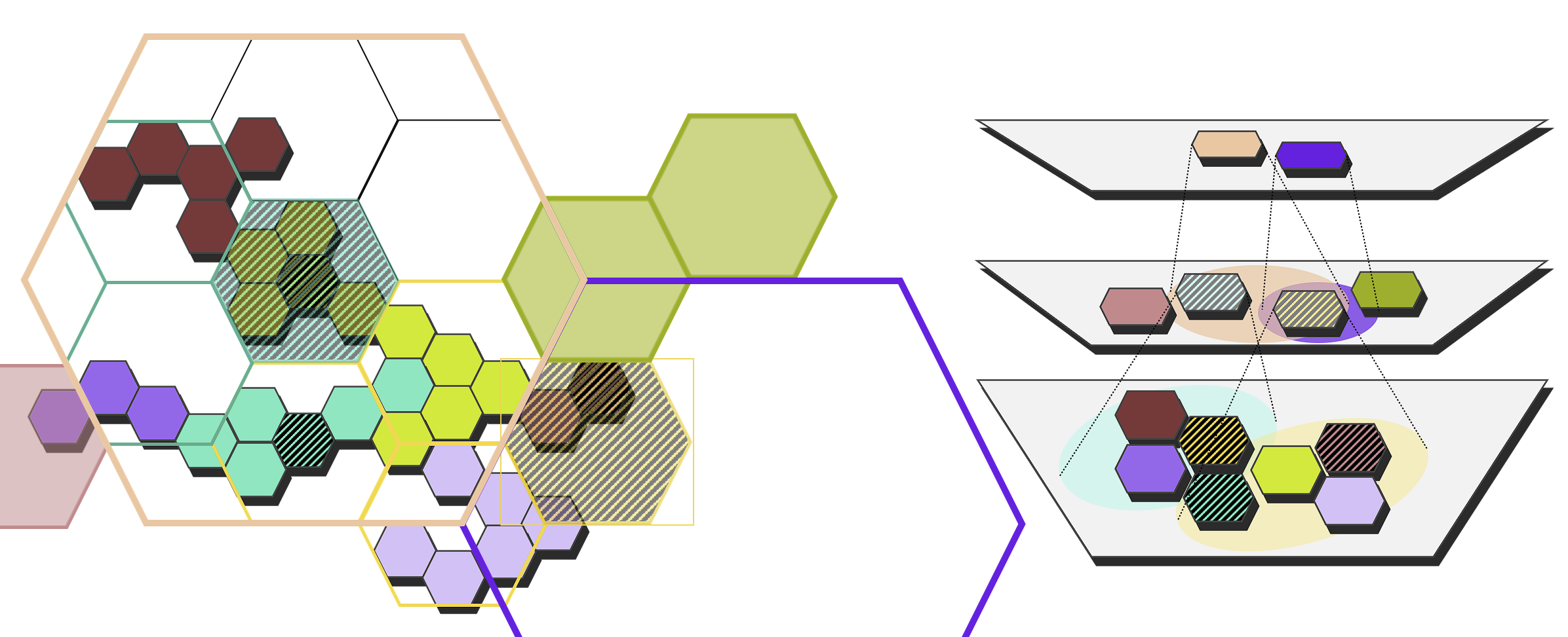 У многоуровневой схемы есть удобное плоское представление, которое эксплуатирует наши врожденные навигационные способности, – отсюда “карта домена”. Это плоскость, замощенная тайлами (плитками, лично я предпочитаю шестиугольники), в которой можно уменьшать и увеличивать масштаб. При этом, конечно, приходится жертвовать размерность и рисовать трехмерную проекцию, простите за такую математическую подробность.