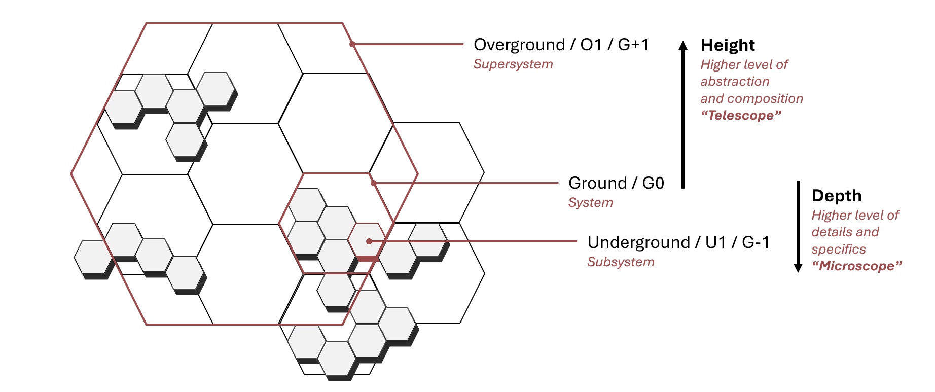 Для начала поговорим о системе координат. В системном мышлении есть базовая логика вложенности систем. Какой бы уровень вы не взяли, всегда можно сказать, что он вложен в системы более высокого порядка (надсистемы) и внутри содержит системы более низкого порядка (подсистемы).