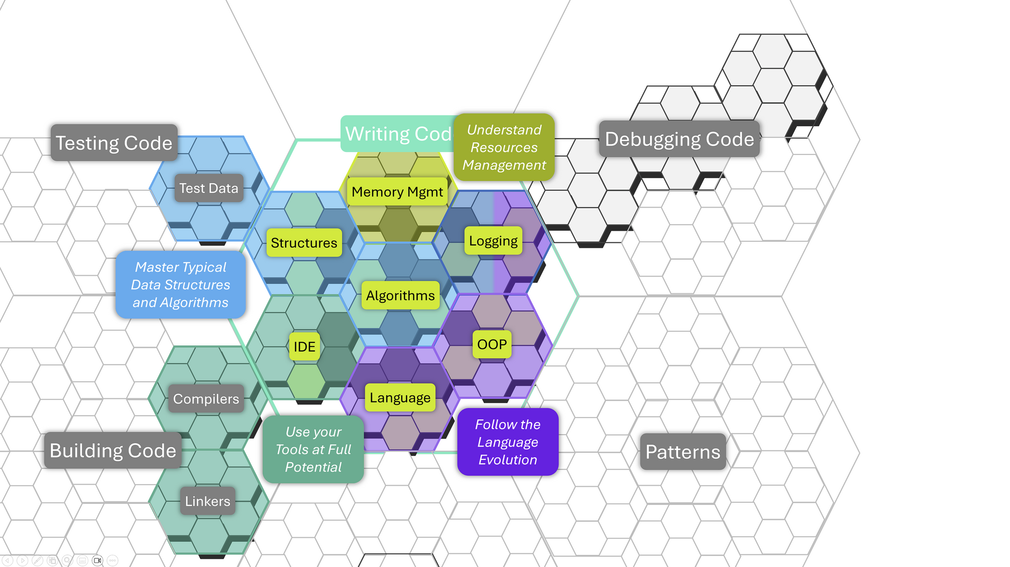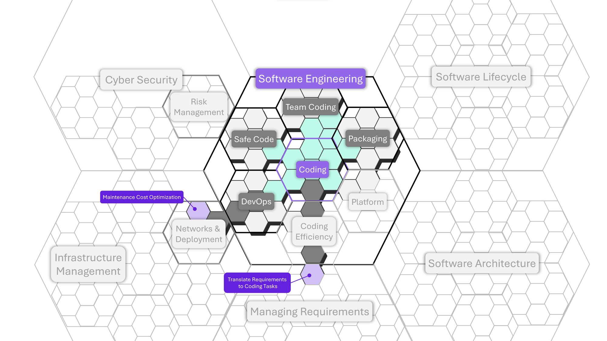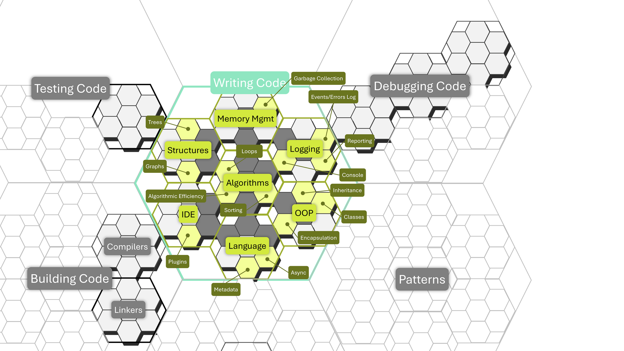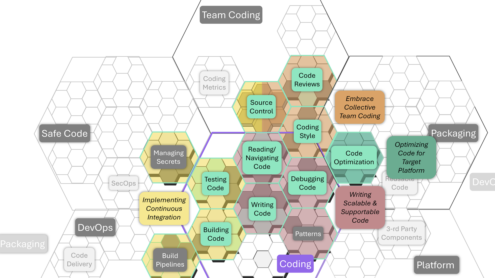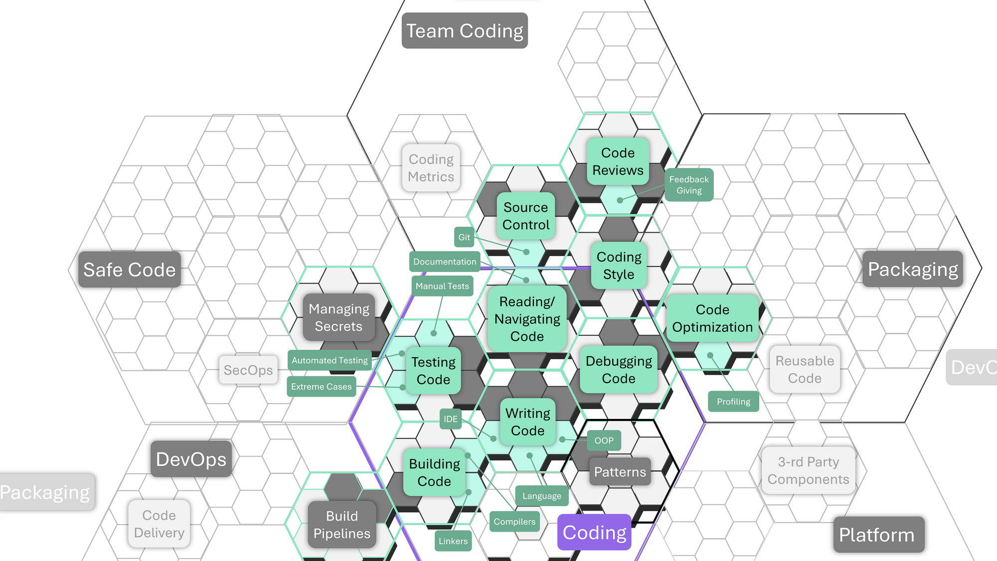 - В центре в фиолетовой ячейке у нас группа компетенций (или навыков) по написанию кода (coding). Она делится на разные подобласти: написание кода, чтение кода, сборка/компиляция кода, отладка кода, тестирование и т.п. Закрашенные области условно обозначают то, что нашей организации важно или, скажем, “закрыто”.