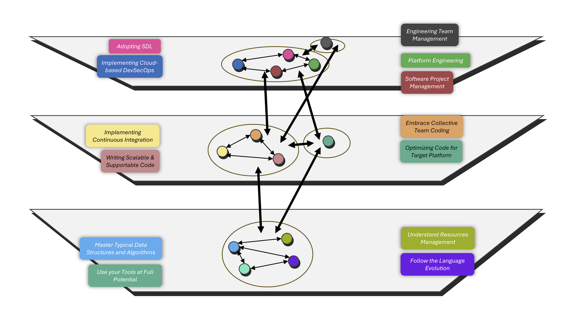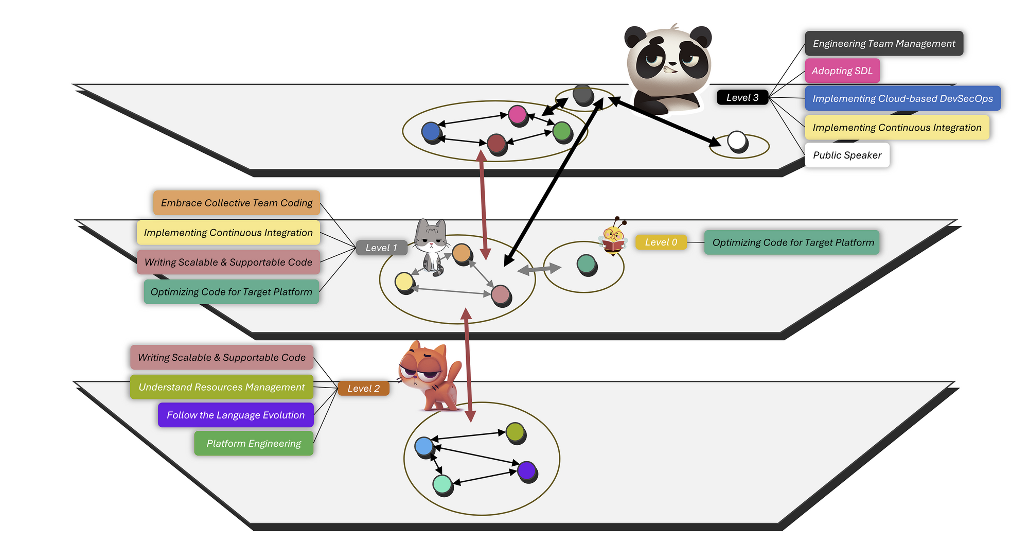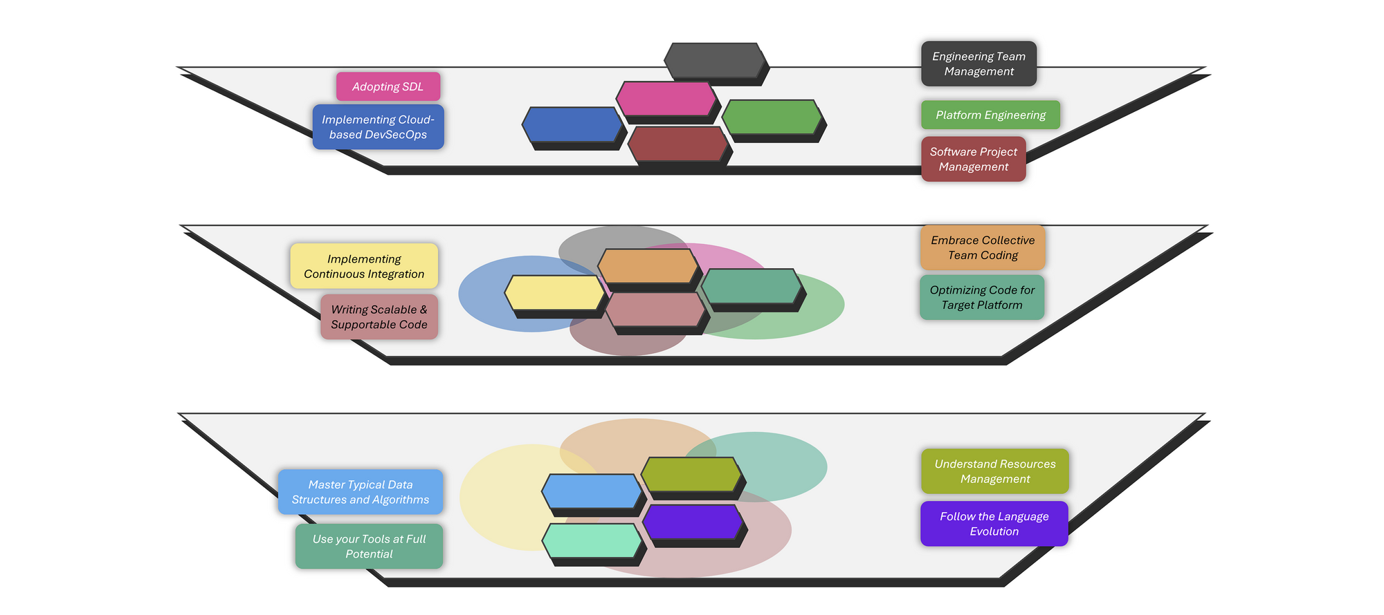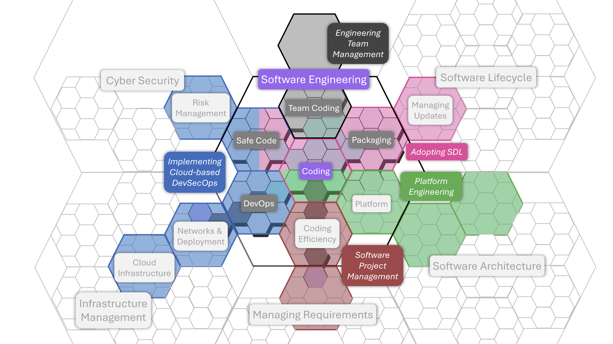 - В больших шестиугольниках обозначены соседние области знаний и навыков: девопс, безопасный код, совместная разработка, упаковка программы, платформы. Некоторые из внутренних подобластей также раскрыты, если организация до них “доросла”.