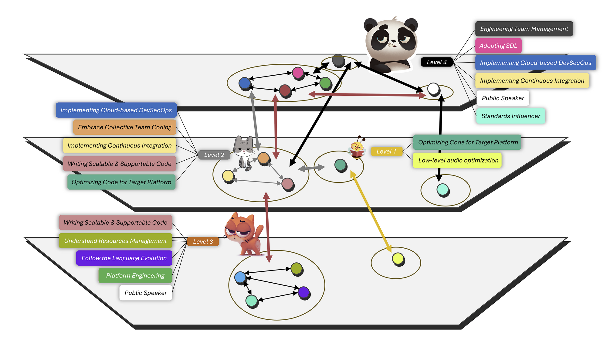 Не факт, конечно, что в вашей организации все будет именно так (а все организации уникальны), но как только вы переносите традиционную иерархию на граф (карту) навыков, вы сразу начинаете видеть, как выстроены каналы для коммуникаций между сотрудниками и кто может найти профессиональный общий язык, а кто, вероятно нет.