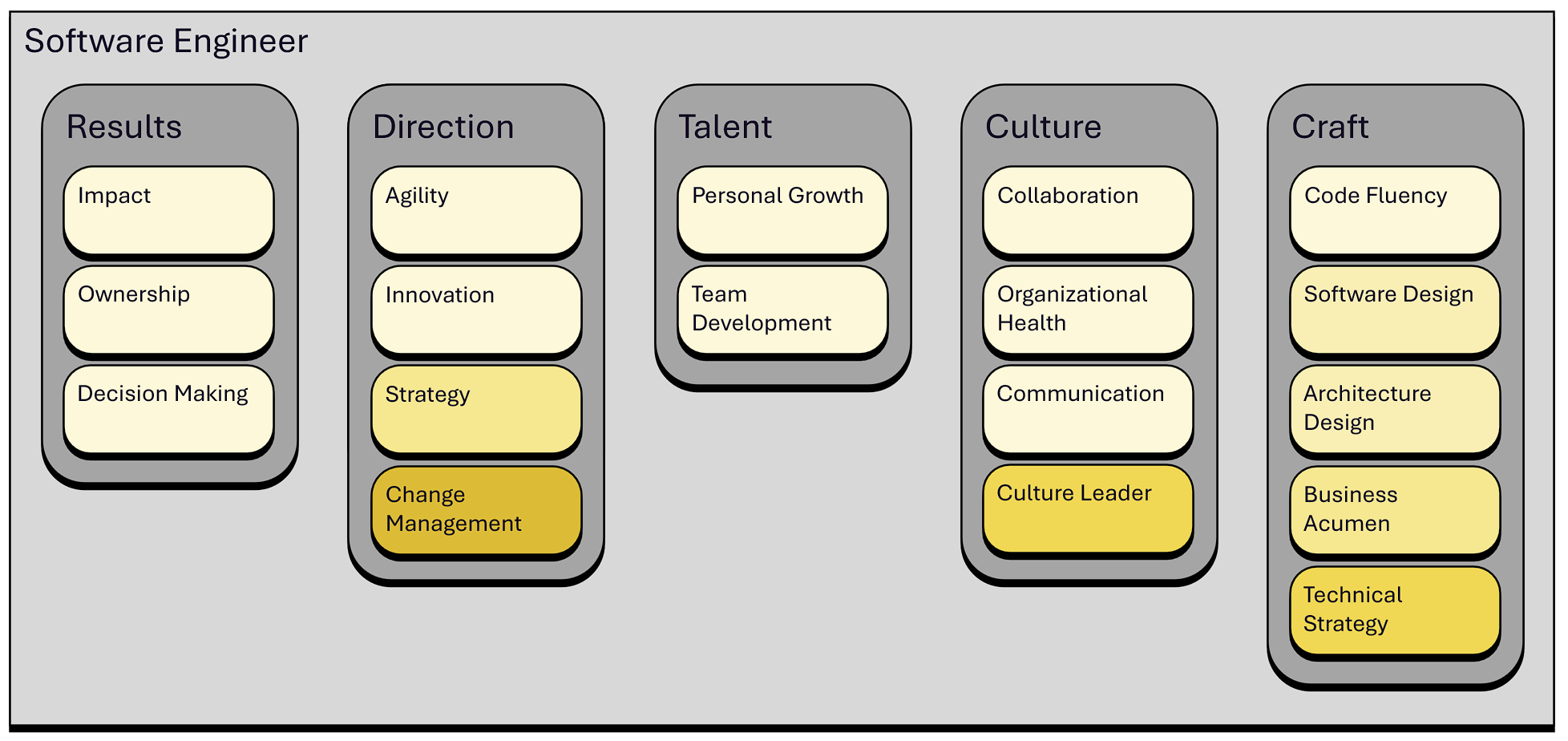 Цветом отмечено, с какого уровня вводится каждый скилл внутри одной из групп. Например, навык управления изменениями требуется на высокой позиции, а на начинающих нужно просто хорошо кодить.