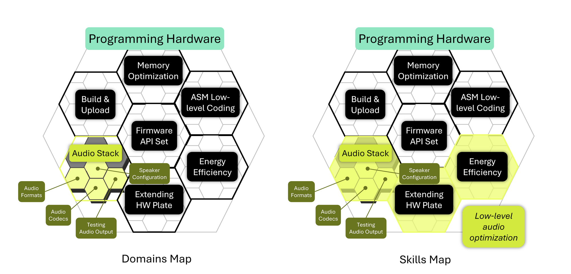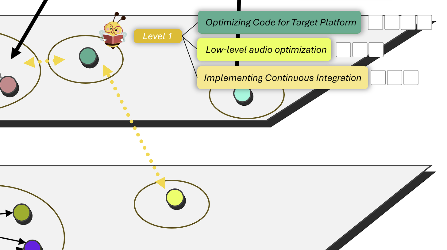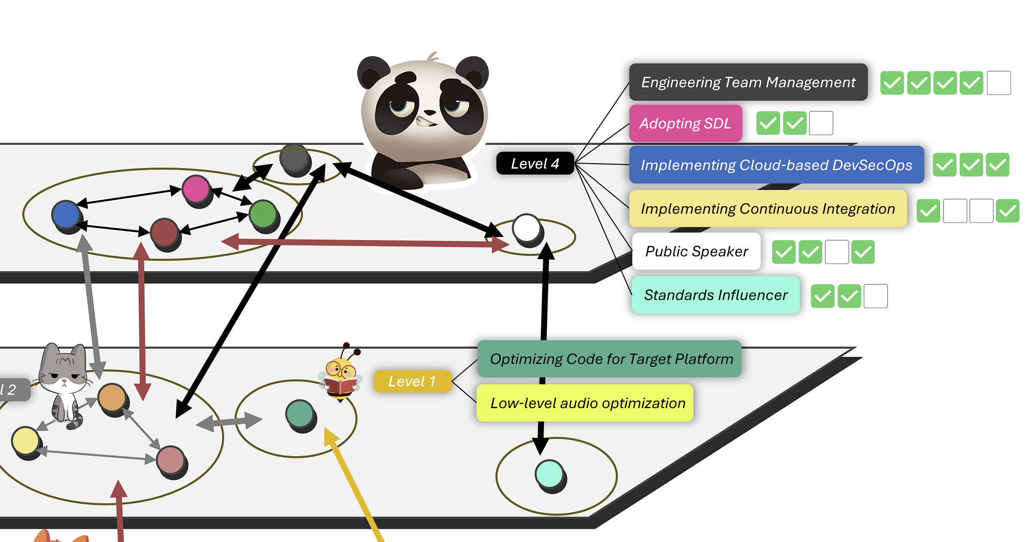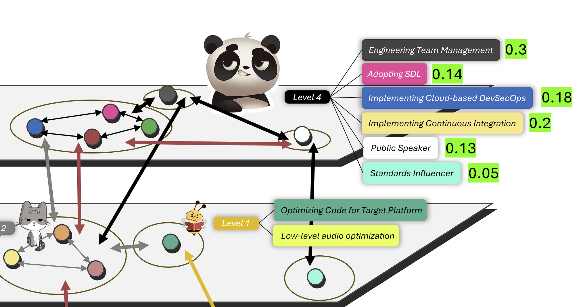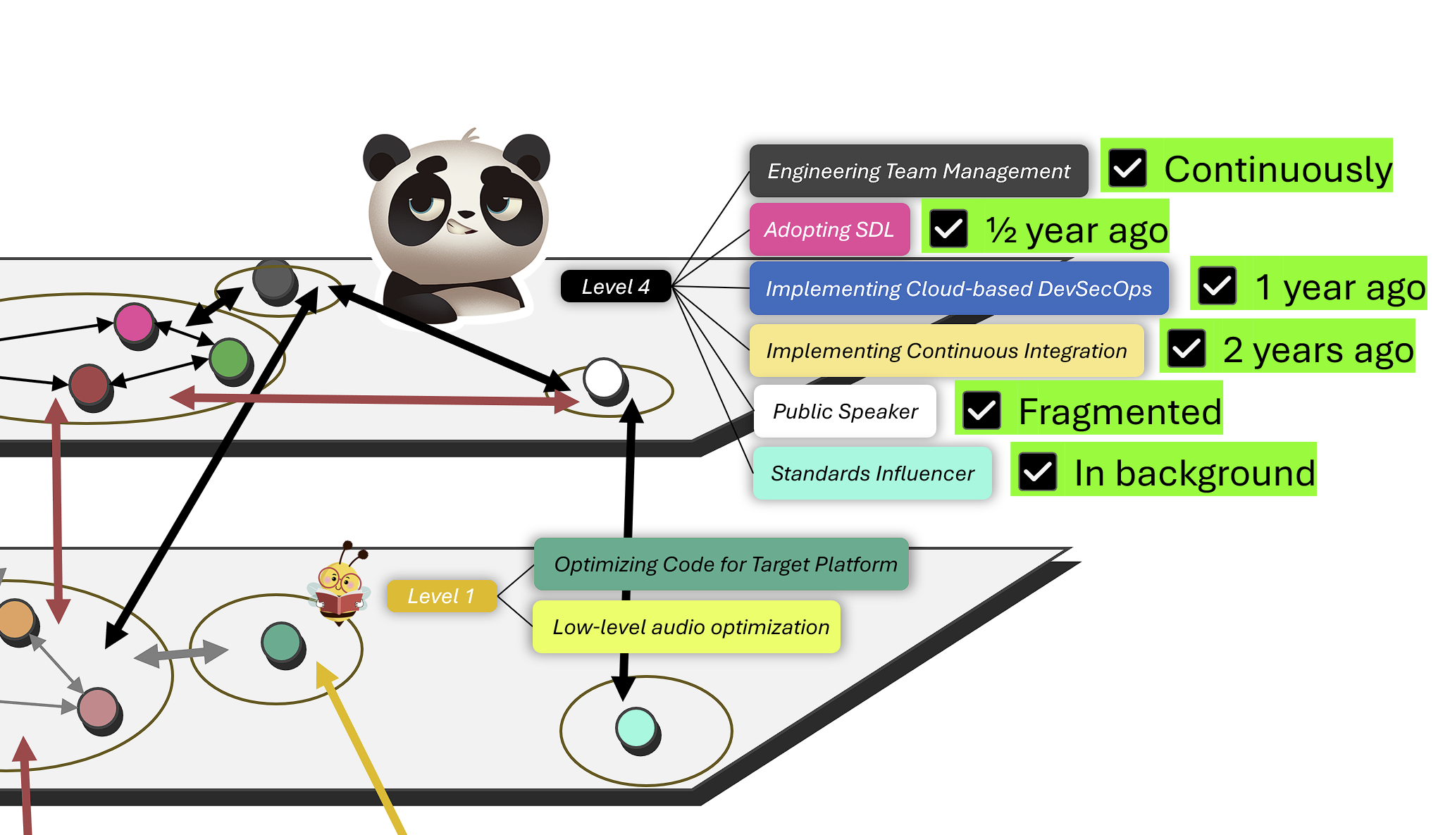 Пчелка решает сосредоточиться на узкой экспертизе в своем домене. Дальше происходит магия, которую пчелка никак не ожидала. Вместо того, чтобы выдать задачки, как это делали на предыдущем месте работы, мудрая панда вовлекает пчелку в картирование домена, лежащего под навыком “низкоуровневой оптимизации аудио”. В этом походе пчелка будет играть для стартапа важную роль первопроходца в новый домен экспертизы.