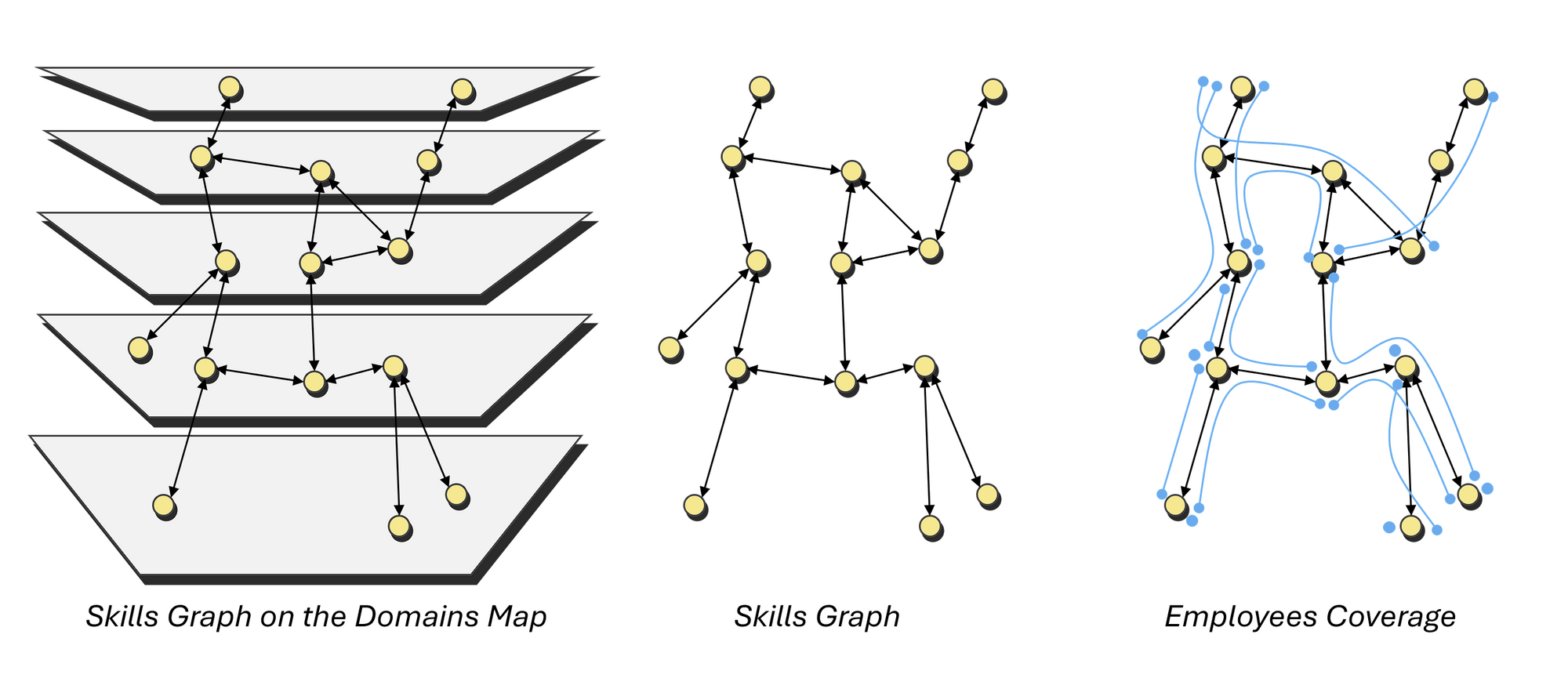 - Формируя карту домена и далее граф навыков, организация может управлять доступными для сотрудников состояниями, в которые можно развиваться, избегая как недостатка покрытия, так и сверхконцентрации. Такая расширенная карта может служить альтернативой штатному расписанию и оргструктуре.