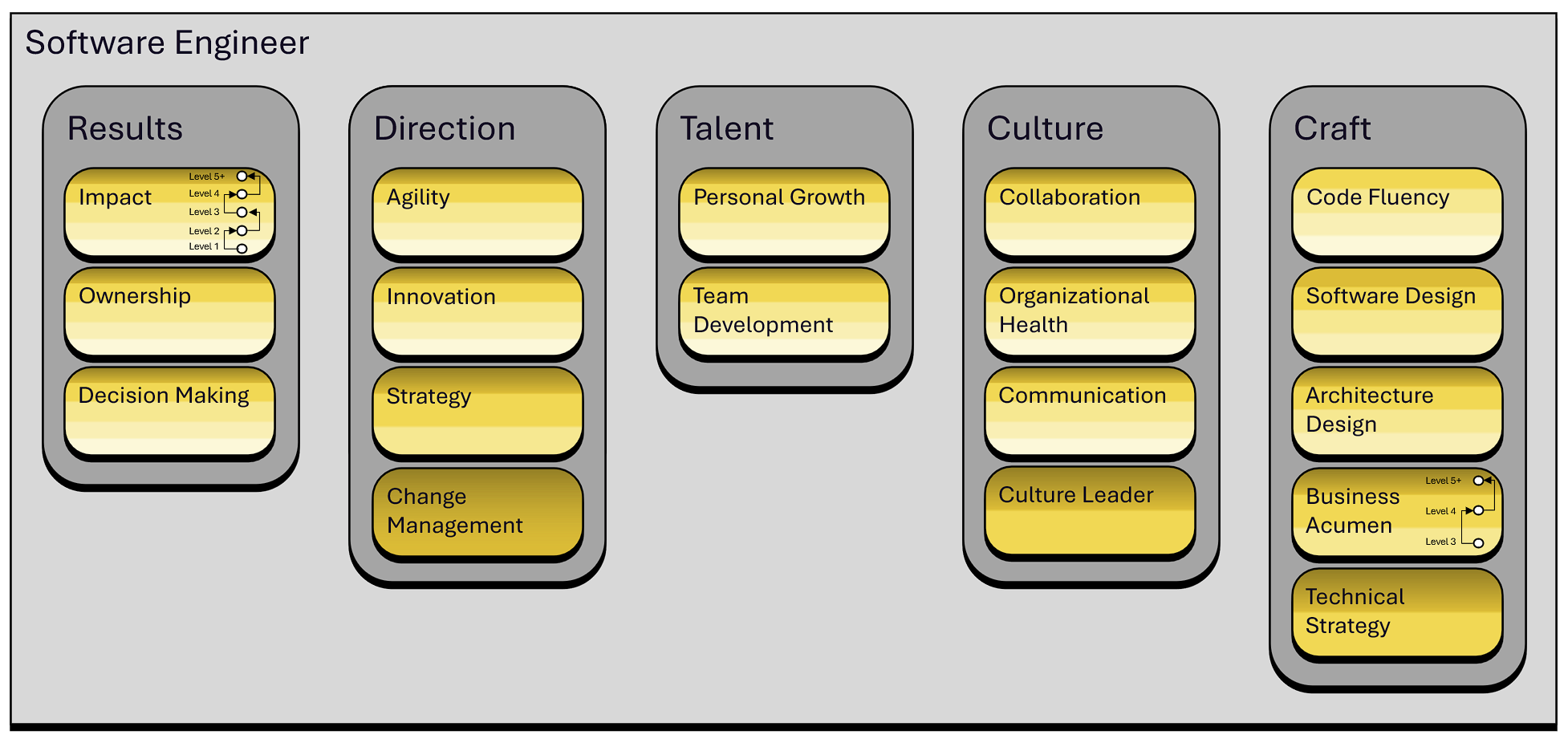 Но вернемся к примеру про софтверных инженеров от Dropbox. Требования по каждому из скиллов можно изобразить в виде карты прогреса, в которой видно, как со временем развивается каждая из составляющих и какого рода работу должен уметь делать и делает сотрудник на каждом из уровней.
