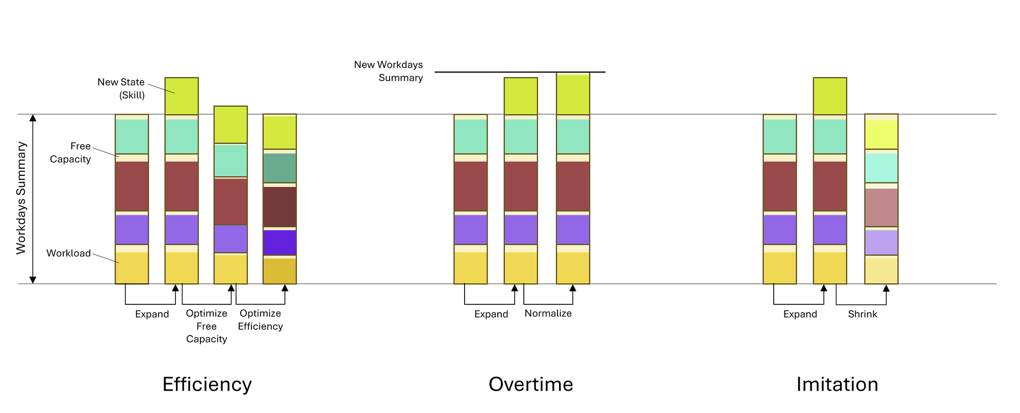 - Повышение эффективности: сотрудник умеет упаковывать и эффективно сочетать все больше состояний в то же самое количество времени. Возможны временные выплески в овертайм, но как исключение на этап освоения. Человек берет эффективностью труда и качеством, а не количеством. Но этот путь требует поиска и адаптации инструментов оптимизации, в том числе изменения мышления и процессов, что ограничивает скорость роста.