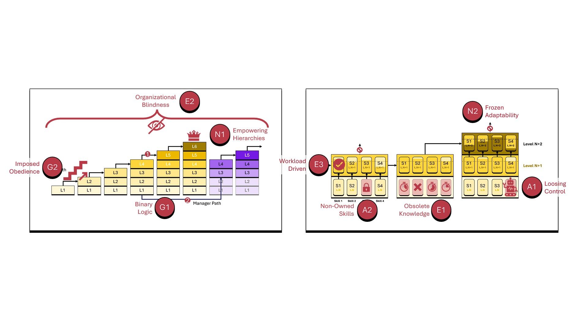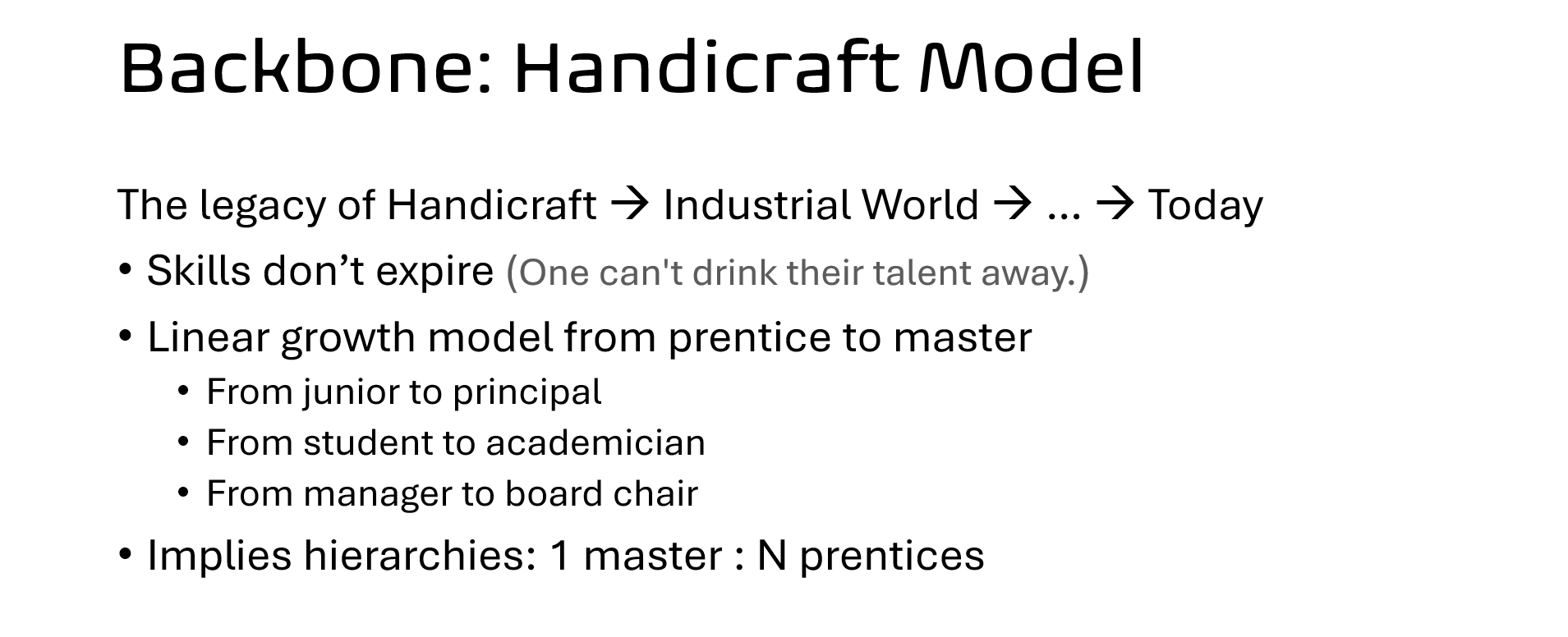 Что же не так с этой прекрасной моделью? Примерно все, но, как говорится, зри в корень: это даже не изъян, а врожденное свойство модели. Классическая сегодня модель роста мастерства пришла к нам из ремесленничества и была приумножена доминирующими иерархическими моделями организации больших коллективов: армии и бюрократии.