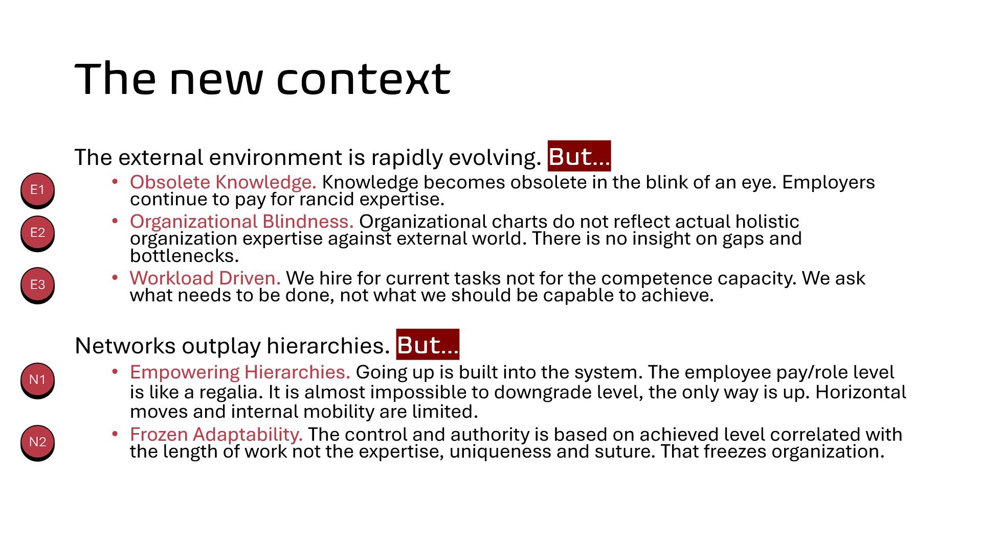 - Организационная слепота. Организационная иерархия не отображает целостного актуального состояния коллективной экспертизы относительно внешнего мира. У вас нет инсайтов на пробелы и узкие места. И вы буквально понятия не имеете, на что способна ваша организация, а на что нет.