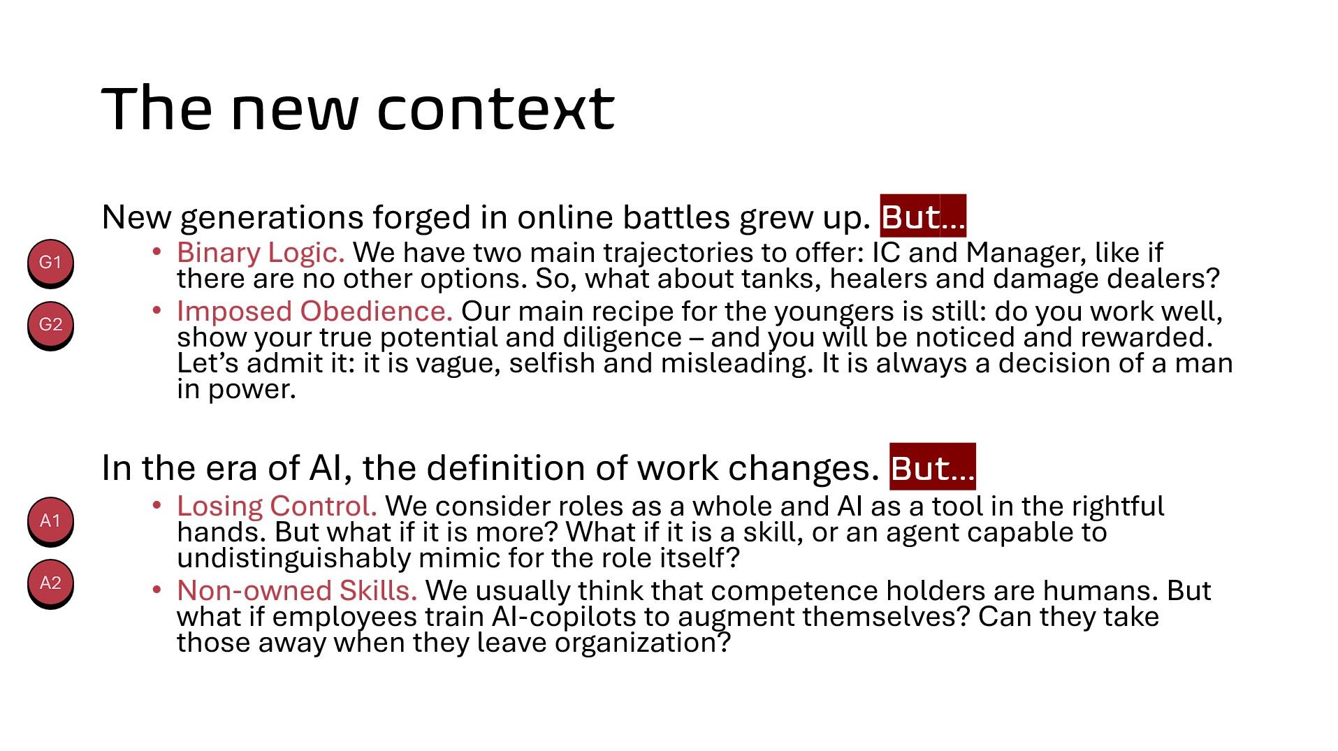 Это мы почесали верхушку айсберга, все еще не понимая в полной мере, что происходит в мире. Но одно можно сказать с уверенностью прямо сейчас: классическая модель ролей и компетенций – это тормоз на пути развития и принятия вечности, сингулярности, реальности.