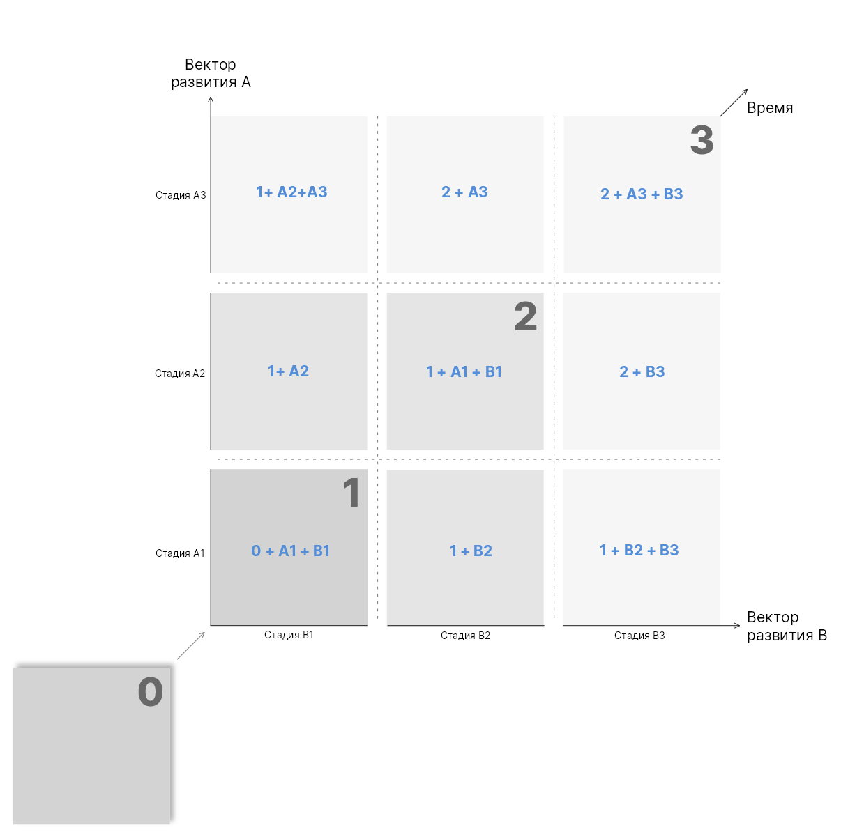 βΠΠΎΠ½ΡΠ΅ΠΊΡ β ΠΌΡΡΠΎβ, ΠΎΡ ΠΈΠ½Π΄ΡΡΡΡΠΈΠΈ: 0-Ξ±-Ξ²-Ξ³-1-2-3. Π‘Π½Π°ΡΠ°Π»Π° ΠΎΠΏΠΈΡΡΠ²Π°Π΅ΠΌ ΠΎΠΏΠΎΡΠ½ΠΎΠ΅ ΡΠΎΡΡΠΎΡΠ½ΠΈΠ΅ (0) ΠΈ Π±Π°ΡΡΠ΅ΡΡ ΠΏΠΎ ΠΎΠ±Π΅ΠΈΠΌ ΠΎΡΡΠΌ, ΠΏΠΎΠΏΡΡΠ½ΠΎ ΠΎΡΠΌΠ΅ΡΠ°Ρ ΠΏΠ΅ΡΠ΅Ρ ΠΎΠ΄Π½ΡΠ΅ Π΄ΠΎΡΡΠΈΠΆΠ΅Π½ΠΈΡ (Π½ΠΎΠ²ΡΠ΅ ΡΠ΅Ρ Π½ΠΎΠ»ΠΎΠ³ΠΈΠΈ, ΡΠΈΡΠΈ ΠΈ Ρ.ΠΏ.). ΠΠ°Π»Π΅Π΅ Π΄ΠΈΠ°Π³ΠΎΠ½Π°Π»ΡΠ½ΡΠΌΠΈ ΡΠ»ΠΎΡΠΌΠΈ ΡΡΠ΅ΠΉΠΊΠΈ ΠΌΠ°ΡΡΠΈΡΡ ΠΎΡ 1 ΠΊ 3.