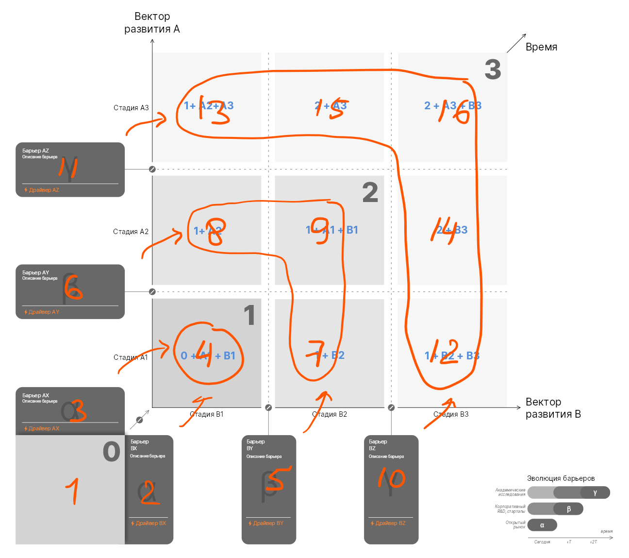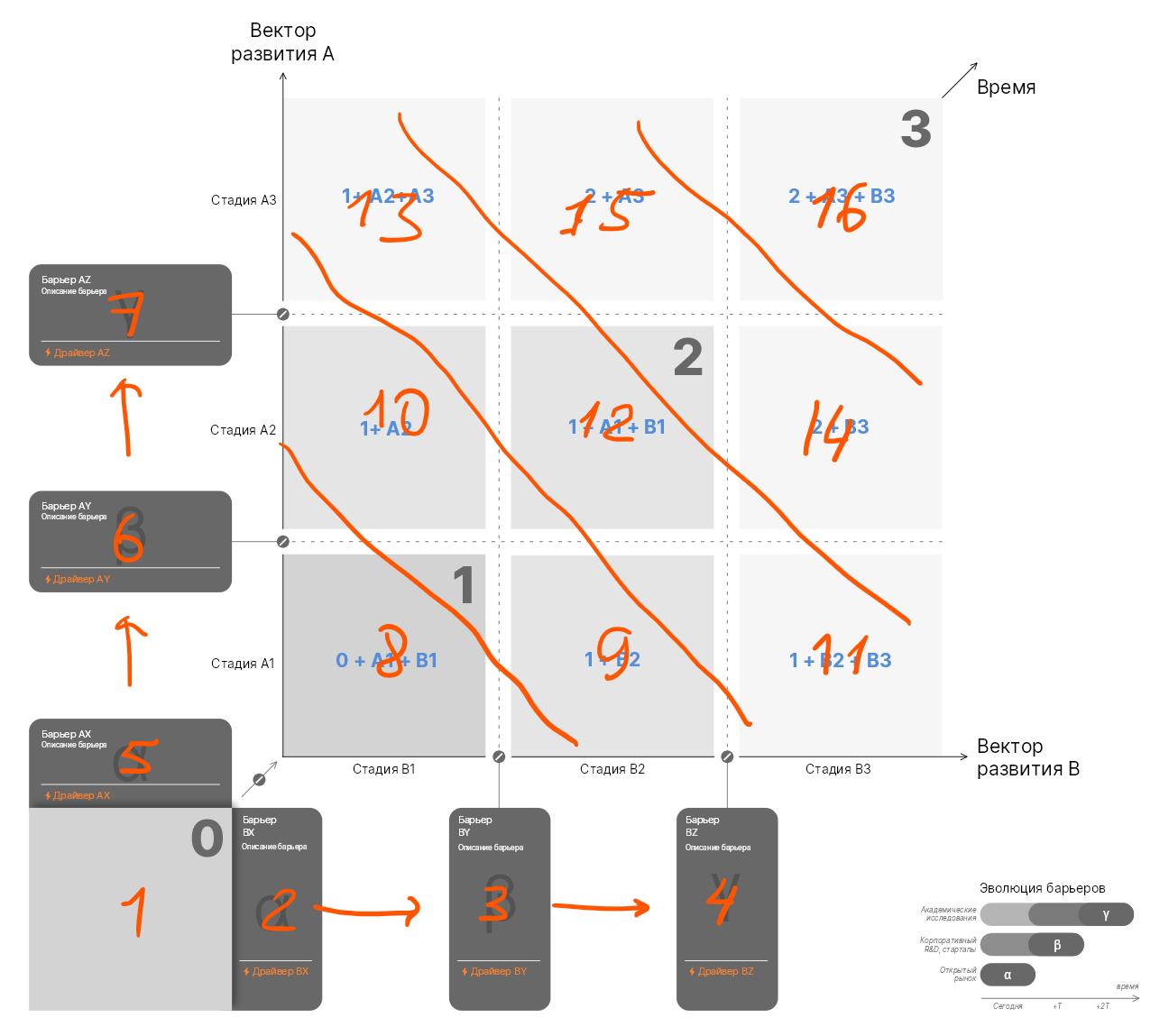 ΠΡΠ΅ΡΠ°ΡΠΈΠΎΠ½Π½Π°Ρ, ΠΎΡ ΠΏΡΠΎΠ΄ΡΠΊΡΠ°: 0-Ξ±-1-Ξ²-2-Ξ³-3. Π‘Π½Π°ΡΠ°Π»Π° ΠΎΠΏΠΈΡΡΠ²Π°Π΅ΠΌ ΠΎΠΏΠΎΡΠ½ΠΎΠ΅ ΡΠΎΡΡΠΎΡΠ½ΠΈΠ΅ (0) ΠΈ Π±Π»ΠΈΠΆΠ°ΠΉΡΠΈΠ΅ βΠ½ΠΈΠ·ΠΊΠΎ Π²ΠΈΡΡΡΠΈΠ΅β Π±Π°ΡΡΠ΅ΡΡ (Ξ±), ΠΏΡΠΎΡ ΠΎΠΆΠ΄Π΅Π½ΠΈΠ΅ ΠΊΠΎΡΠΎΡΡΡ ΠΏΠΎΠ·Π²ΠΎΠ»ΡΠ΅Ρ Π²ΠΏΡΡΠ³Π½ΡΡΡ Π² ΡΠΎΡΡΠΎΡΠ½ΠΈΠ΅ (1). ΠΠ°Π»Π΅Π΅ ΡΠΊΠ°Π·ΡΠ²Π°Π΅ΠΌ Π±Π°ΡΡΠ΅ΡΡ Ξ² ΠΈ Π΄ΠΎΠ·Π°ΠΏΠΎΠ»Π½ΡΠ΅ΠΌ ΠΊΠ»Π΅ΡΠΎΡΠΊΡ (2). ΠΠ°Π»Π΅Π΅ Π±Π°ΡΡΠ΅ΡΡ Ξ³ ΠΈ Π΄ΠΎΠ·Π°ΠΏΠΎΠ»Π½ΡΠ΅ΠΌ ΠΊΠ»Π΅ΡΠΎΡΠΊΡ (3). ΠΠΎΠΏΡΡΠ½ΠΎ Ρ Π±Π°ΡΡΠ΅ΡΠ°ΠΌΠΈ ΠΎΡΠΌΠ΅ΡΠ°Π΅ΠΌ ΠΏΠ΅ΡΠ΅Ρ ΠΎΠ΄Π½ΡΠ΅ Π΄ΠΎΡΡΠΈΠΆΠ΅Π½ΠΈΡ (Π½ΠΎΠ²ΡΠ΅ ΡΠ΅Ρ Π½ΠΎΠ»ΠΎΠ³ΠΈΠΈ, ΡΠΈΡΠΈ ΠΈ Ρ.ΠΏ.).