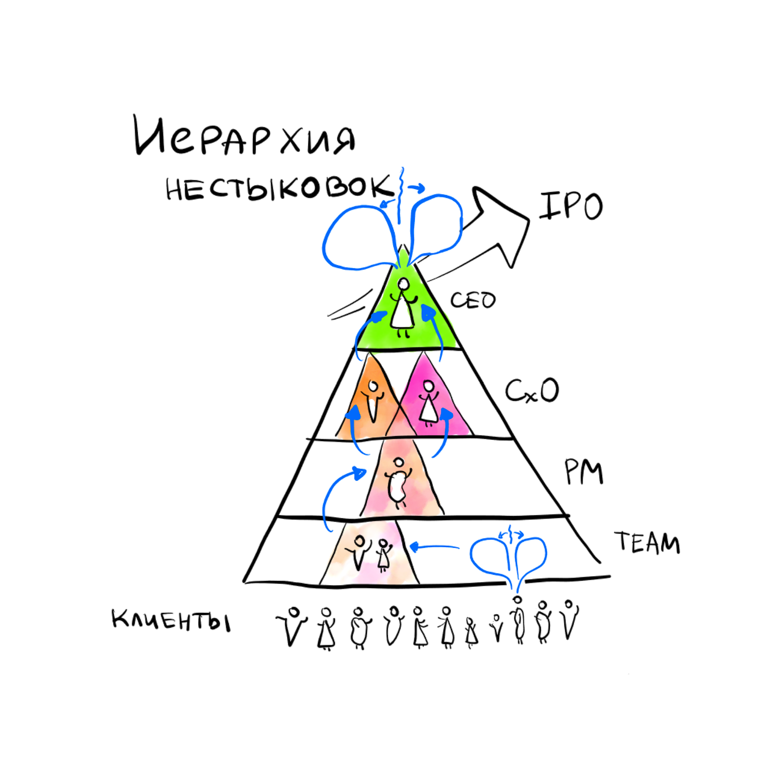 Представьте себе следующую ситуацию: у нас есть IT-компания, вчерашний стартап, в котором еще пять лет назад CEO сама обзванивала клиентов, а сегодня по уши погружена в задачи выхода на IPO. А где-то там внизу корпоративной иерархии (а она уже разрослась до 5-6 уровней!), трудится продуктовая команда конкретной фичи и вот ей нужно “достучаться наверх”.