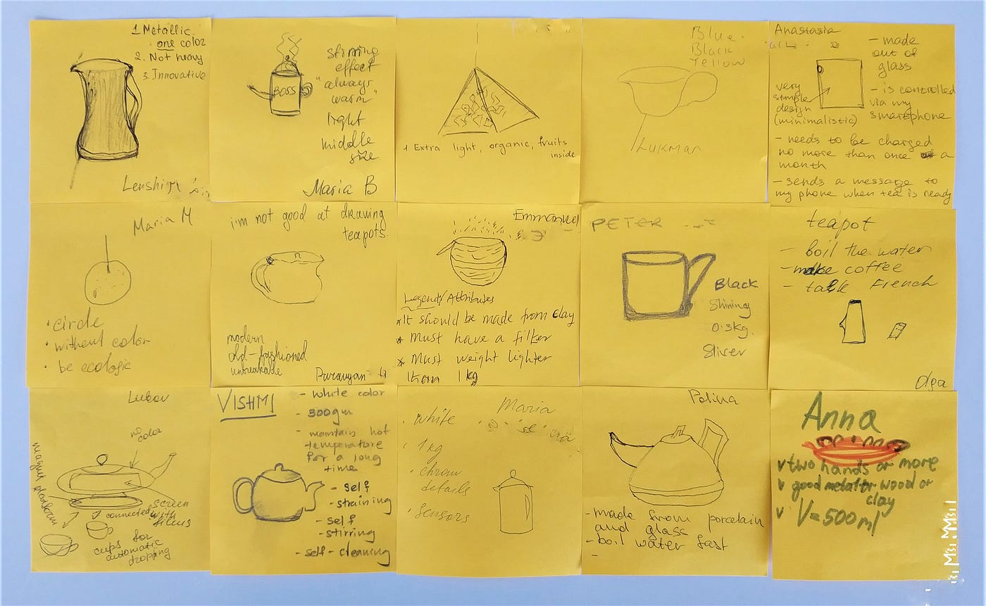 I quickly gave every person a sticker and asked to draw a teapot, write down some attributes and put a name on it as well. I was curious whether there will be any significant difference among these smart people (both male and female)? And there was!