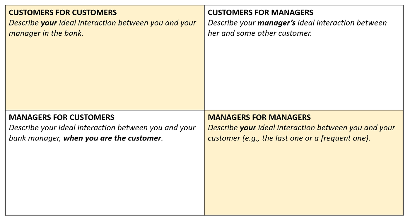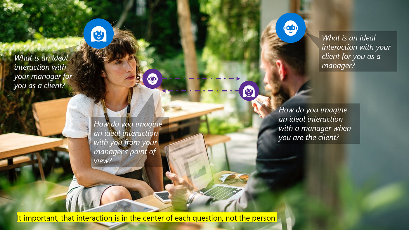 For customer: “What do you think is the goal of your manager? How is this communication between two of you designed from his side? If you were on his place, what would you ask somebody like you about? How do you think this interaction impacts his bonus? What information would you try to extract from the customer if you were him?”