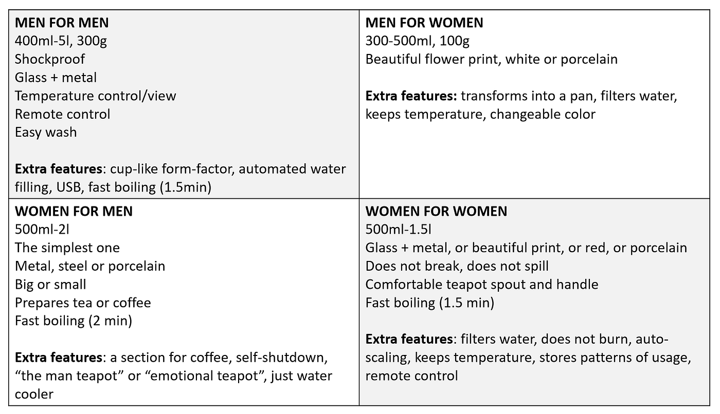 - In practice in many core aspects (e.g., volume, material) the ideal “men-men teapot” is closer to the “women-women teapot” than to the “men-women” or “women-men” ones.