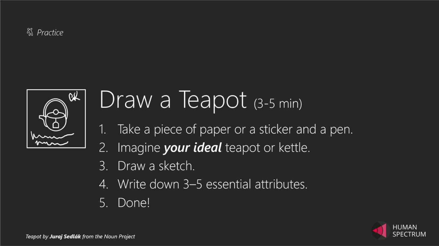 And reflecting back on the teapot-exercise, you might ask both parties to describe how they would design this interaction for themselves, and for the other side: