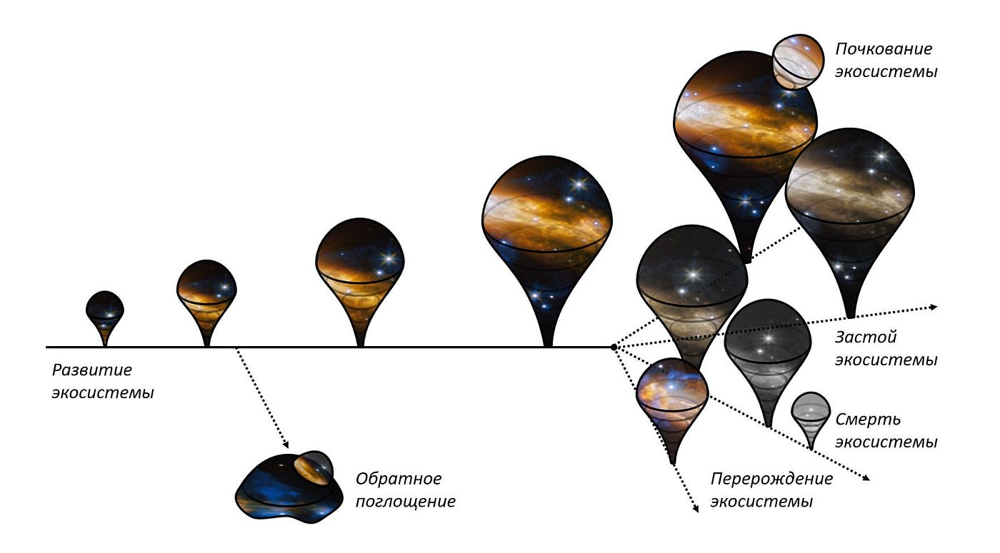Обратите внимание, варианта “экосистема развивается вечно” нет. Мы живем в мире ограниченных ресурсов. Единственный способ продолжить развитие — это почкование или перерождение.