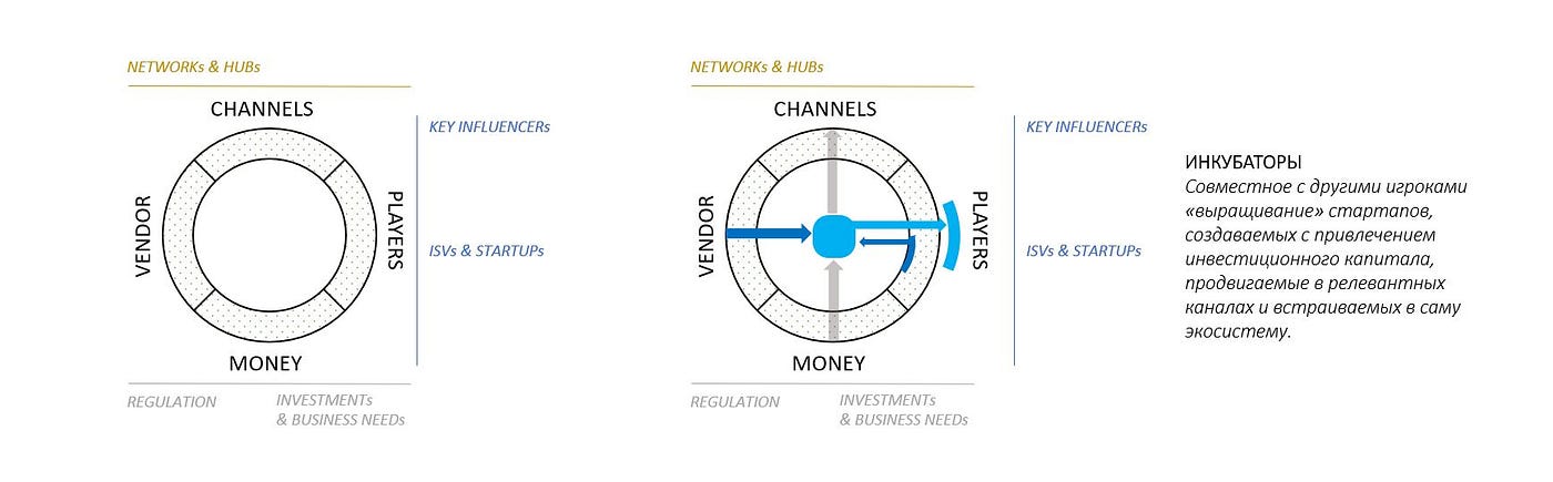 Схема экосистемы с точки зрения вендора (слева) и пример работы со схемой (справа).