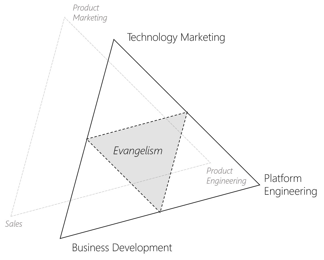 Евангелизм — это функция платформы. Так как мы говорим о технологиях, то нас интересует потенциал роста экосистемы в некотором направлении. Технологическая экосистема вырастает на базе платформ (API, SDK и т.п.), которые можно использовать, расширять, настраивать под себя. Не обязательно, кстати, это платформа какого-то одного вендора вроде Microsoft, это может быть комбинация разных решений, слоев и т.п., тогда в нашем фокусе появляются задачи интеграции и последующего продвижения подобных “симбиозов”.