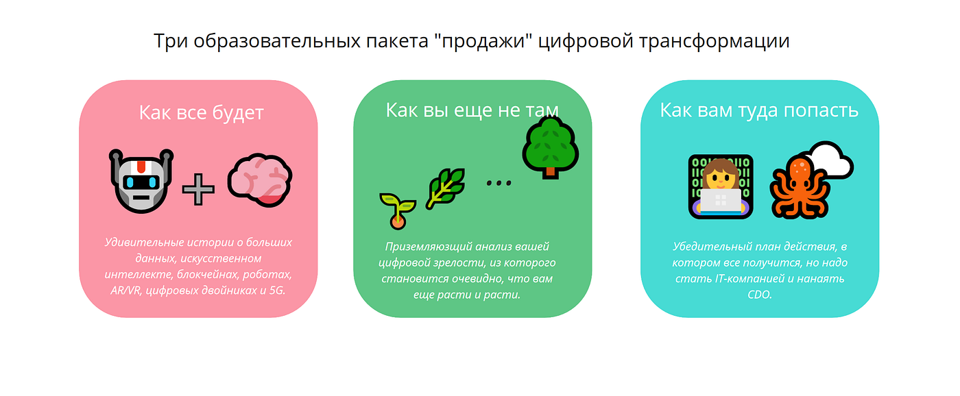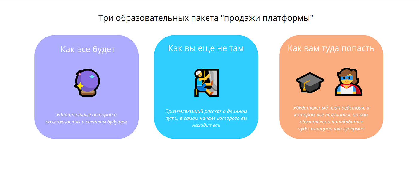 Продажа любой платформы, как правило, сопровождается тремя “образовательными” пакетами, последовательно рассказывающими, 1) как будет, 2) как вы еще не там и 3) как вам там оказаться.