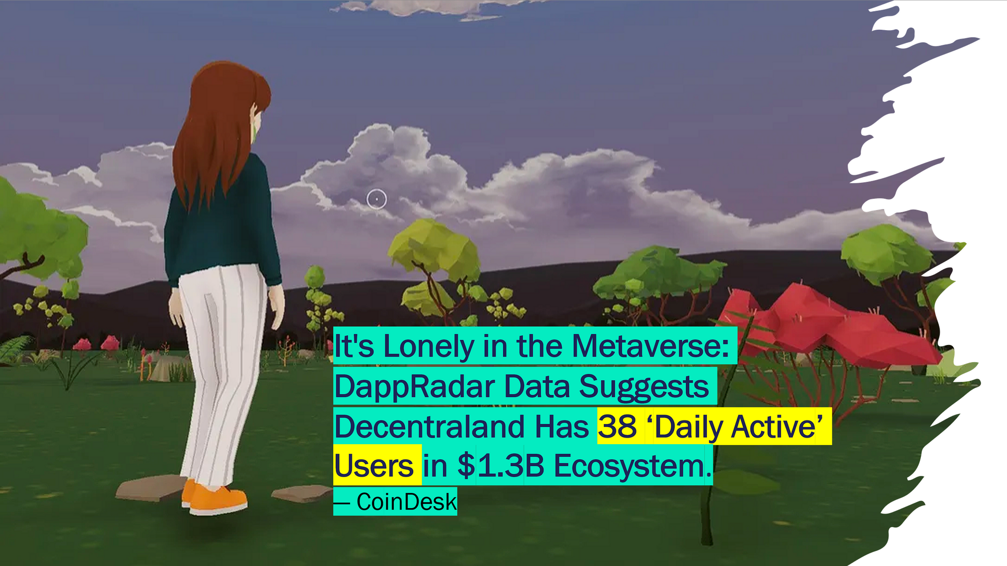 Например, CoinDesk отмечает, что при капитализации в $1.3B Decentraland, который очень часто приводят как пример в контексте рассуждений о метаверсе и веб3, на самом деле, имеет не более 1000 активных пользователей в день – максимум 675 по оценке DappRadar. Представители Decentraland говорят о 8000 в день. Но восемь тысяч, Карл! Восемь! Против оценки в ярд.