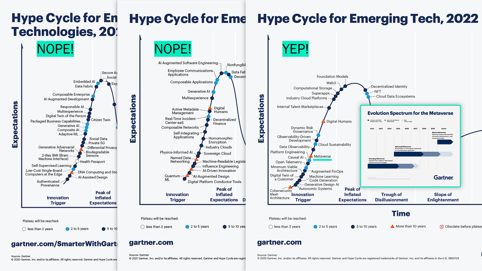 К августу 2022 проснулся Gartner и наконец-то разглядел метаверс в своем хайп-цикле развивающихся технологий. Но тоже есть нюанс: до метаверса, по мнению аналитиков компании, копать еще лет десять. Хотя отдельные его элементы и технологии, конечно, будут проявлять себя раньше.