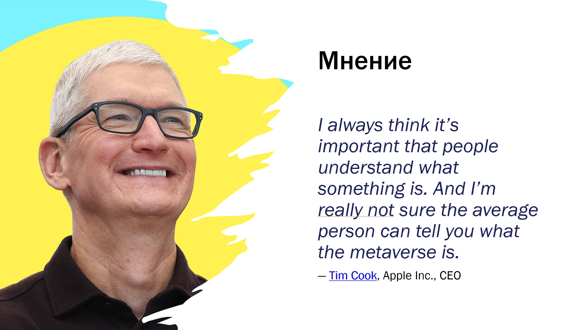 Например, пока Meta топила за виртуальные миры в Oculus, Джон Ханке, глава Niantic (вы знаете эту компанию по Pokémon GO), высказывался в духе, что “метаверс как виртуальная реальность – это ночной кошмар”. И вообще нужно не уводить людей в виртуальность, а наоборот возвращать их в реальность. В чем-то это похоже на позицию Apple: Тим Кук продолжает топить за дополненную реальность и говорит, что в общем-то никто не может объяснить, что такое метаверс.