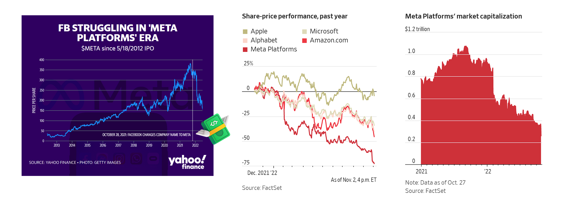 Во-первых, акции Meta Inc. грохнулись вместе с остальным рынком, но, возможно, даже и чуть больше. И дело не только в общем кризисе, но и в том, что Марк стал меньше зарабатывать денег, потому у него упали рекламные доходы, потому что Тим Кук решил, что прайваси - наше все и не надо Марку слишком много знать про пользователей айфонов.