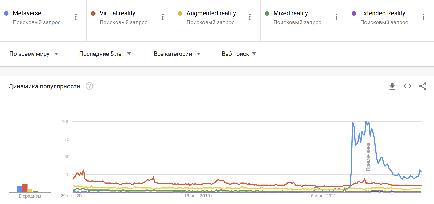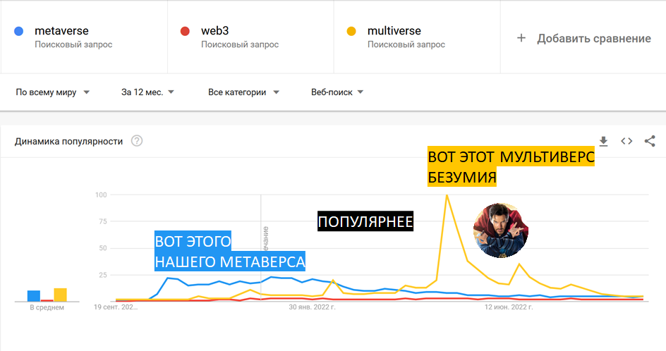 Тем временем обычные граждане, как мы с вами, почти окончательно запутались, чем отличаются метаверс, медиаверс и мультиверс, поэтому следующий график вас не удивит (это гугл-тренды):