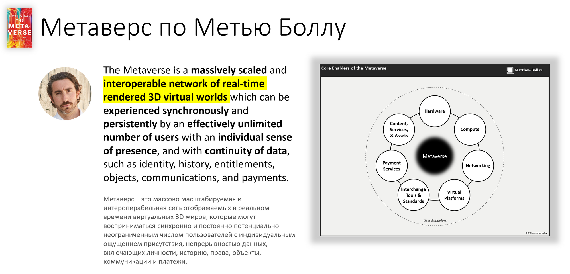 Так вот, Метью Болл выводит некоторое определение метаверса, с которым можно работать, а в наше время это уже много!