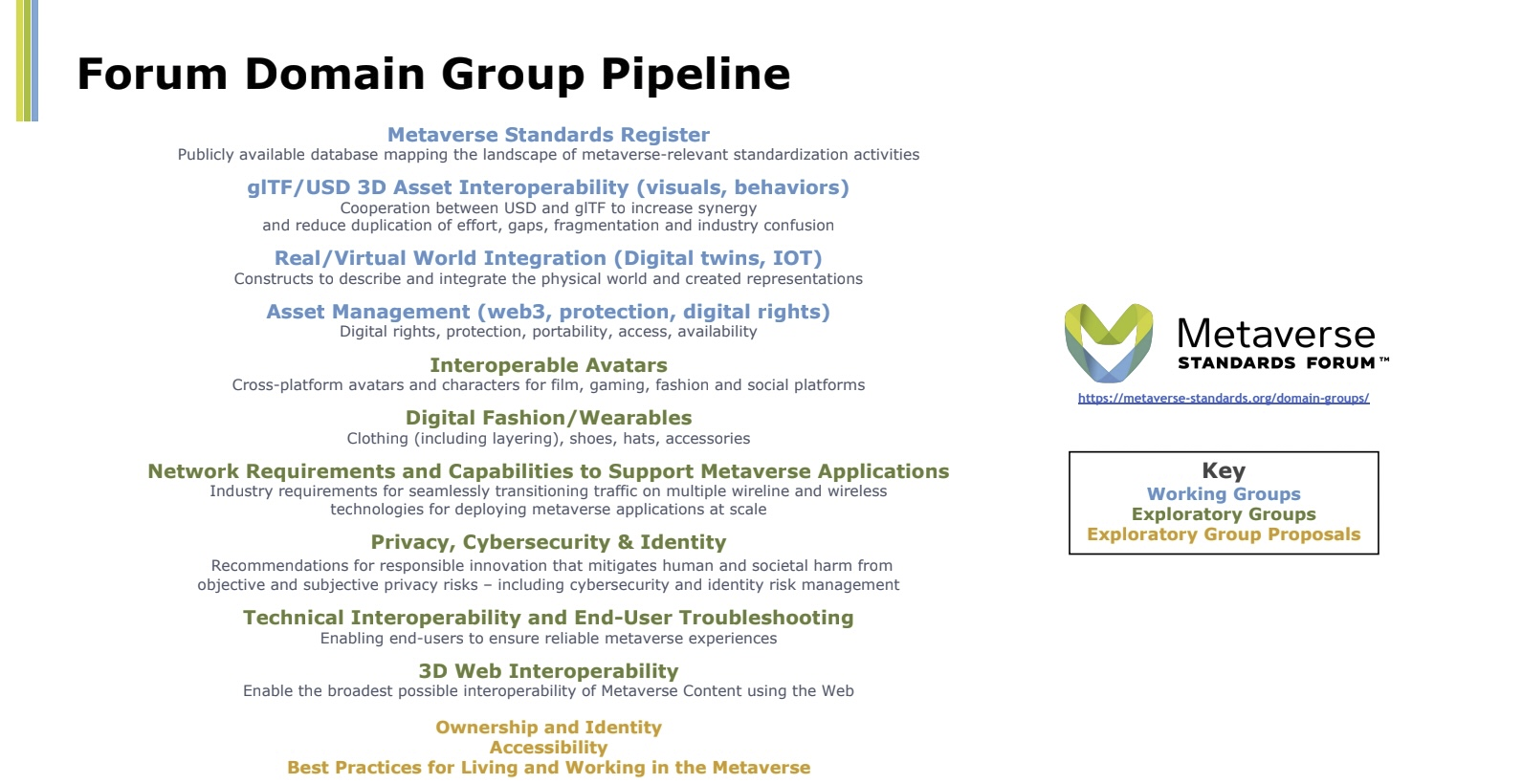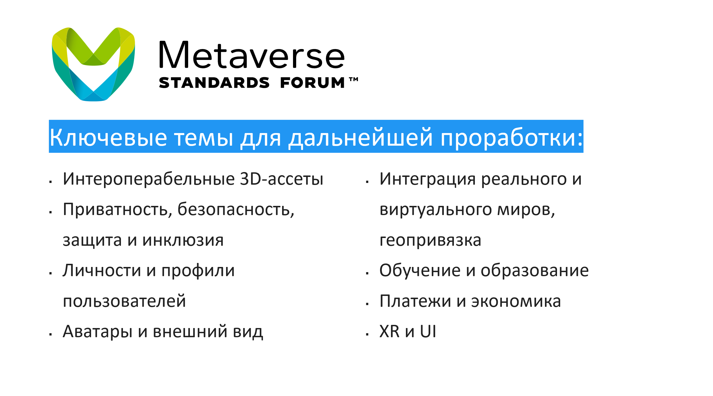 Отчасти технологическая структура метаверса от Метью Болла совпадает с экспертной коллективной позицией форума по стандартам для Метаверса, который летом наконец-то разродился приоритетными направлениями для дальнейшей работы сообщества: