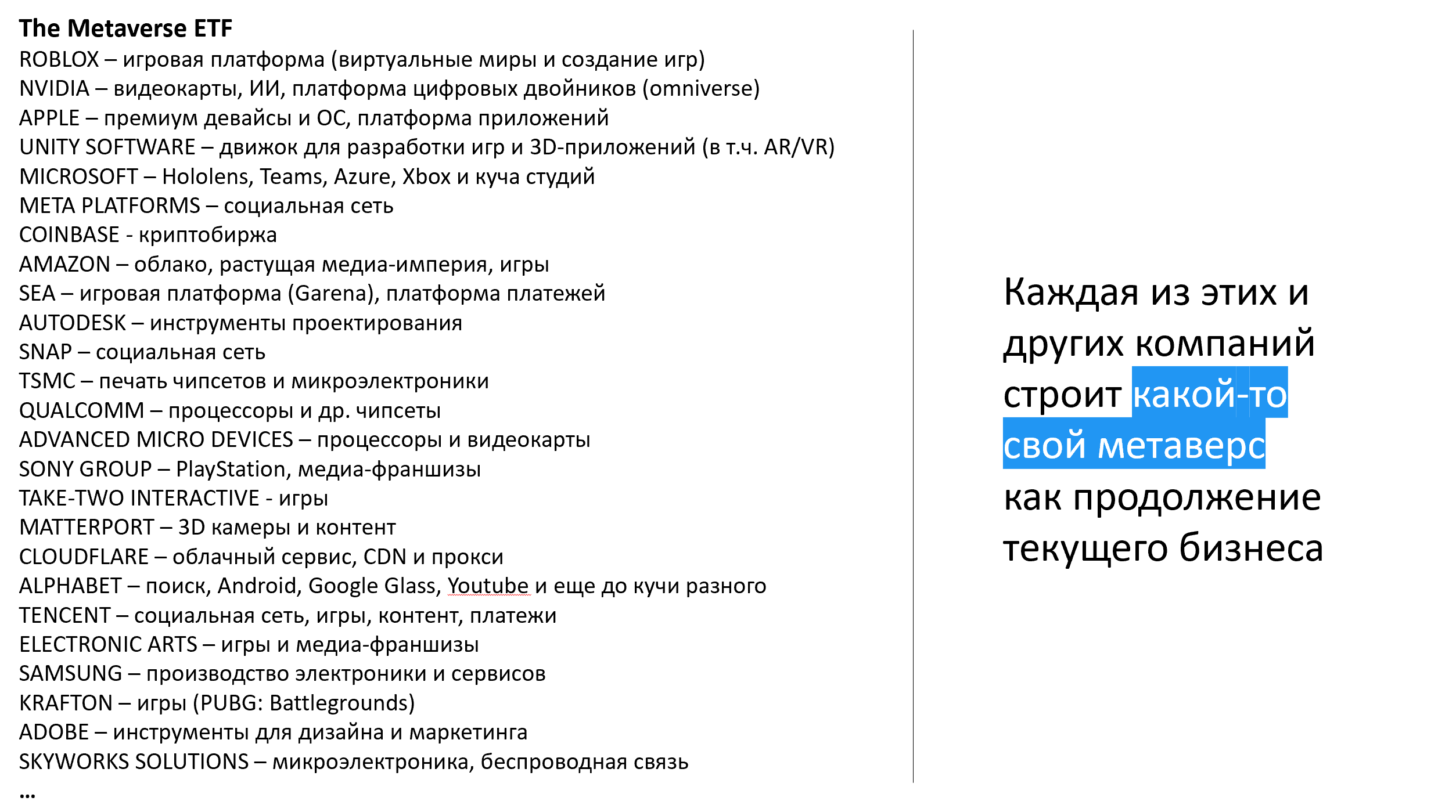 Из этого индекса вы не только можете понять, во что инвестировать, если вы верите в будущее метаверса (ну вдруг?), но прикинуть, что из себя этот метаверс будет представлять. Потому что в этом разрезе (напомню, что тут только публичные компании), метаверс будет неминуемо продолжением текущей деятельности каждой из включенных компаний.