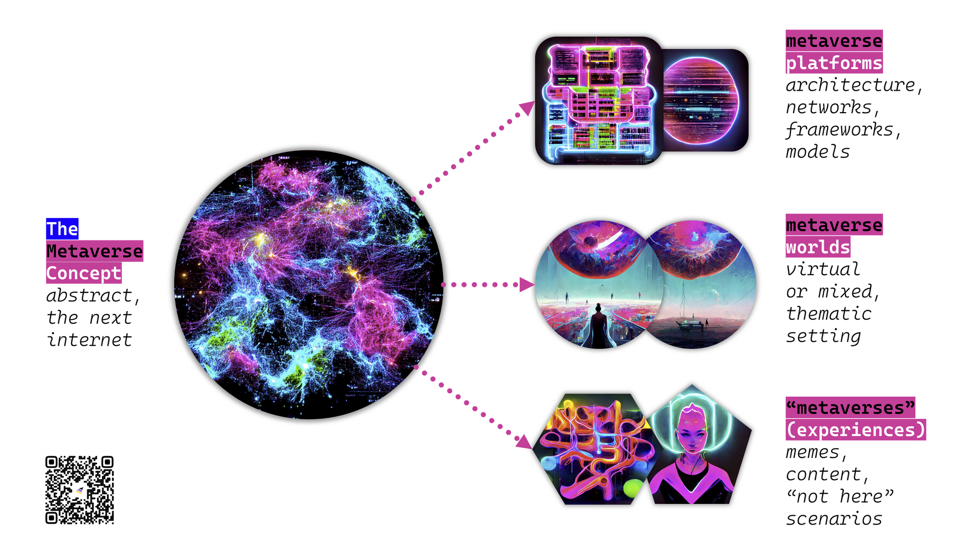 - Метаверсы как платформы Метаверса (metaverse platforms) – варианты реализации концептуального Метаверса от разных компаний и групп, вероятно, отчасти совместимые (интероперабельные); технологические стеки, архитектуры, сети и фреймворки. Пример использования: “Метаверс от Microsoft будет опираться на сегодняшние наработки в Teams и Mesh-аватарах поверх Azure”.
