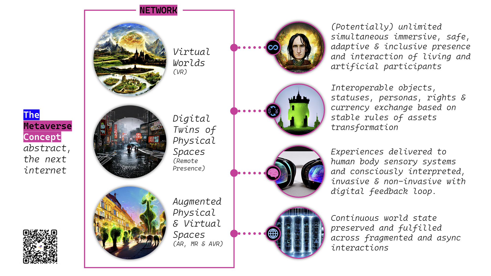 Метаверс – это цифровое расширение пространства деятельности человечества, представляющее собой сеть а) виртуальных миров, б) актуализируемых в реальном времени цифровых двойников существующих физических пространств и в) виртуальных наслоений над ними: