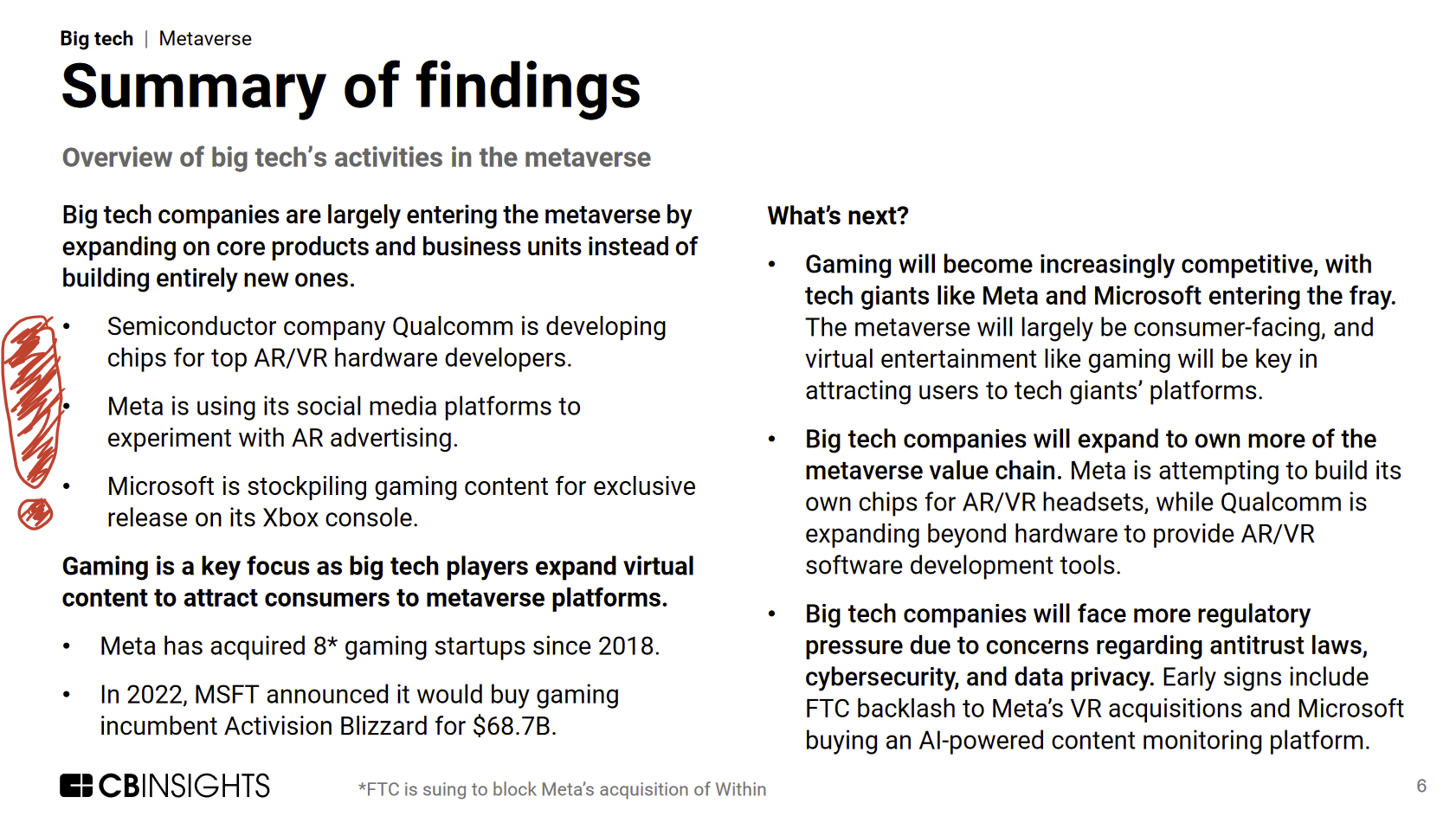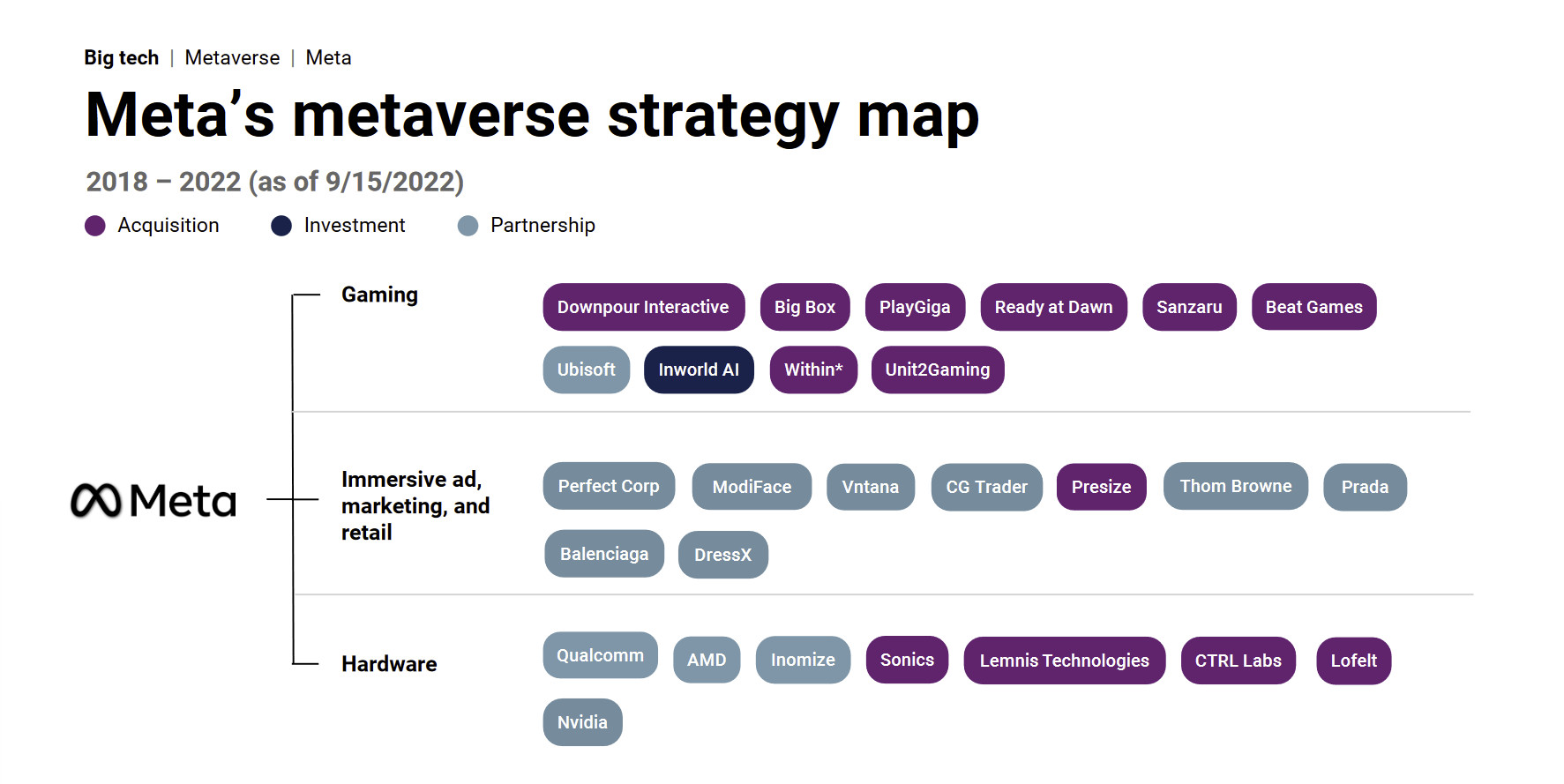 ROBLOX продолжит делать игровую платформу, Nvidia – вычислительные устройства и алгоритмы, Apple – консьюмерские девайсы, Unity – инструменты разработки, Microsoft – топить за облако и игровой контент, Meta – развивать социальные сети, и т.д. Это такой неизбежный взгляд: метаверс как продленное настоящее современных технологических компаний. Примерно это же сообщает нам CBInsights: