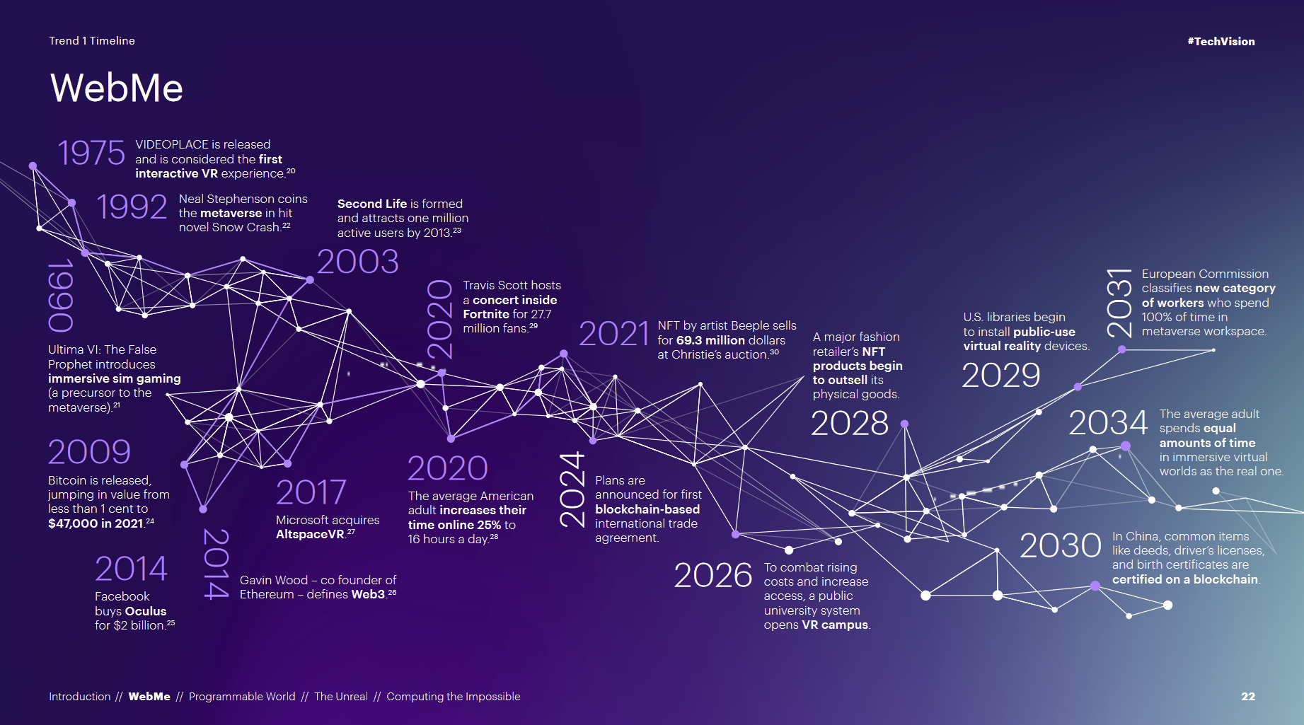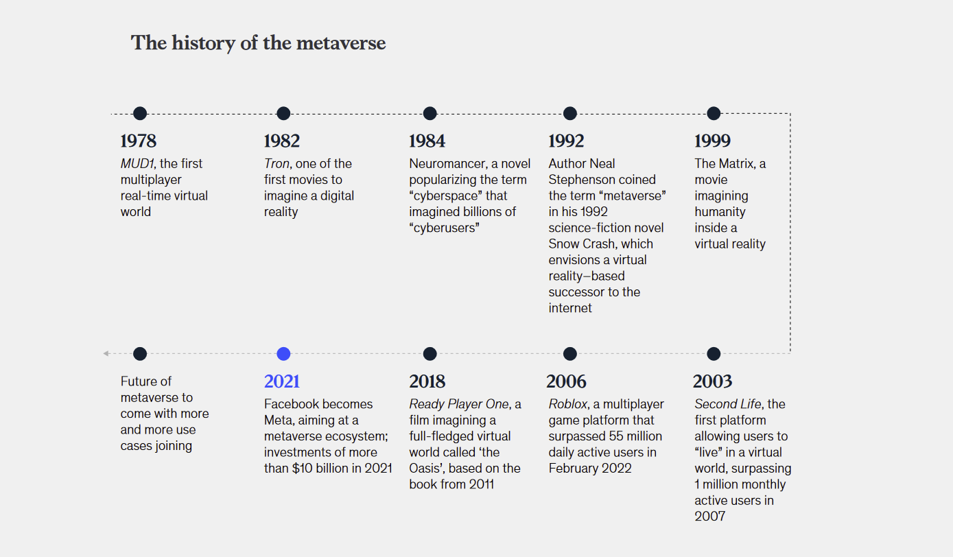 McKinsey, например, отматывает историю метаверса аж в 1978 год – время появления первых мультиплеерных игр. Accenture, в свою очередь, идет еще дальше – в 1975 год выпуска первого интерактивного VR-приложения VIDEOPLACE.